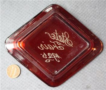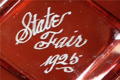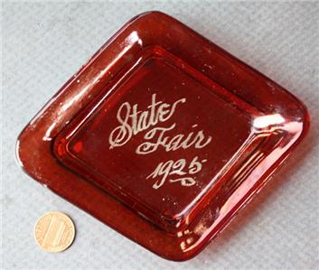 Check it out...Here's a very uncommon souvenir ashtray from a State Fair in 1925- Where it is from, I have no idea- The 4 1/2" wide by 5 1/2" tall by 1" deep ruby glass ashtray reads: "State Fair 1925" in metallic silver lettering in the center well-Great condition with only light edge wear- Unmarked on back-A Real VINTAGE Beauty ready for display! This is an ORIGINAL item, NOT A REPRODUCTION item! Postage information is listed at the bottom-Calculated shipping is required which is EXACTLY what the post office will charge us to sign it.