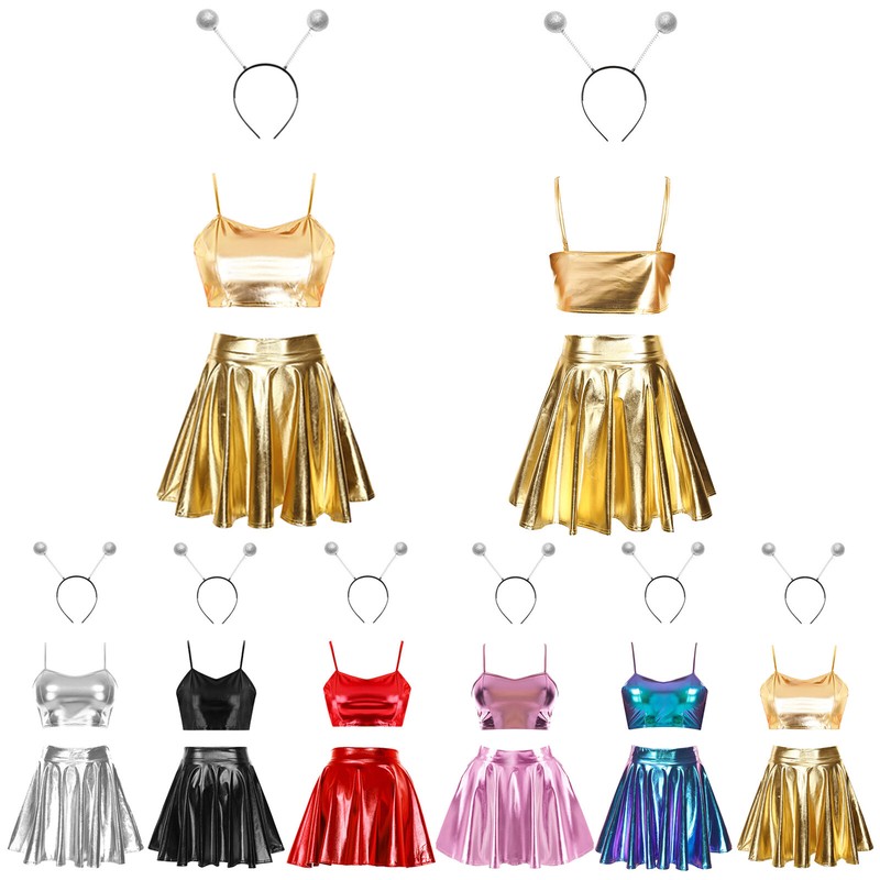 Including crop top, swing skirt and 1 pair of gloves. Metallic patchwork, chic contrast, brings shiny and fashionable details for this outfit.