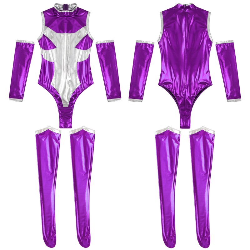 Bodysuit designs with mock collar, sleeveless, back hidden zipper, high cut and slim fit; matches with a pair of detachable sleeves and stockings.