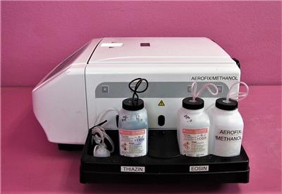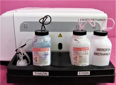 Staining options include a Rapid stain mode, a longer Wright-Giemsa mode and a May Grünwald Giemsa (MGG) mode. These modes allow variation in the eosin/thiazin ratio and the spin time (see Appendix D). A fully programmable Custom stain mode is also available. Near the end of the staining cycle, after purging the lines and rinsing the slides with methanol, the slides are rapidly dried by high-speed carousel rotation.