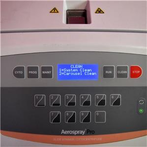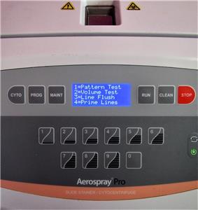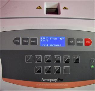 The Aerospray Hematology Pro Slide Stainer/Cytocentrifuge (Model 7152) is a dual-purpose, microprocessor-controlled slide staining and cell preparation system. In use, atomizing spray nozzles apply fresh reagents onto microscope slides prepared with blood or other body fluid specimens. The slides are mounted in a rotating carousel for processing.