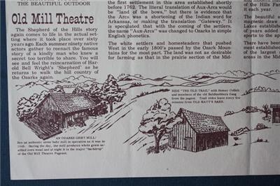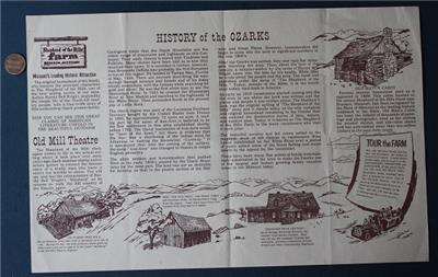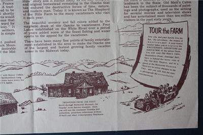 Check it out...Here's a unique original 14" wide by 9" tall colorful paper placemat souvenir from the 1960-70s Era Ozark Mountain Shepherd of the Hills tourist region of Branson Missouri-The placemat features cartoon images of people, places & things titled: "Shepherd of the Hills Branson, Missouri History of the Ozarks" with images of Old Matt's Cabin, Tour the Farm, Old Trail, Grist Mill & more with lengthy text & info inset on front -The placemat is in great condition with only light wear expected from age and has been lightly folded by original owner but would display so nicely - How many of these fragile throwaway items survived? This is an ORIGINAL item, NOT A REPRODUCTION item! Postage information is listed at the bottom-$ 4.95 postage is required.
