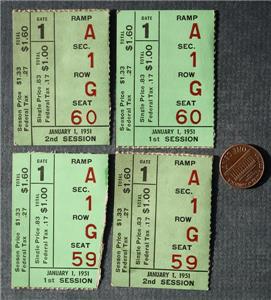 Check it out...Here's a unique original set of 4 (FOUR!) 1 3/4" wide by 2 1/4" tall ticket stubs from the 1951 Logansport Indiana high school basketball "Big Four" Tournament at Logansport, Indiana on January 1, 1951-Each has minor scrapbook mounting stains on backside only-(See photos below for clarification)-A unique vintage set from a very uncommon Indiana tourney game! These are ORIGINAL items, NOT REPRODUCTION items! Postage information is listed at the bottom-$ 4.95 postage is required.