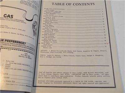 This for the Horror fiction magazine, New Blood. It is from 1987. Various writers contributed such as Ray Garton, Janet Fox, David B. Silva and Ron Leming among others. Clean other than a red mark near Dead Man on the contents page. Being sold as vintage to add to your collection or reading pleasure.
