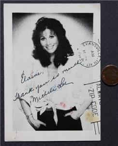 Check it out...Here's a 3 1/2" wide by 5" tall AUTOGRAPHED B&W postcard photo that has been 100% authentically signed by popular "Knots Landing" TV star Michelle Lee-The photo has a large 100% genuine signature signed "Elaine- Thank You So Much, Michelle Lee" in black ink pen on front. Back has a 1983 postmark from California on back and an Evansville Indiana postmark on front.
