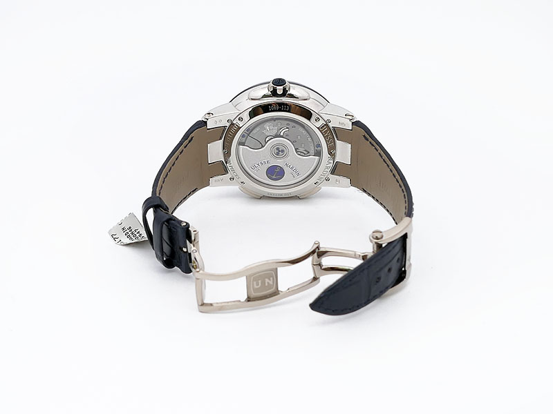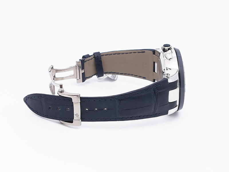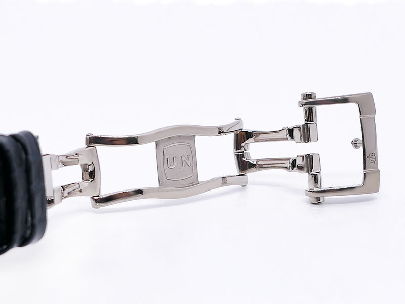 caseback. Blue leather strap with UN White Gold Deployment Buckle.