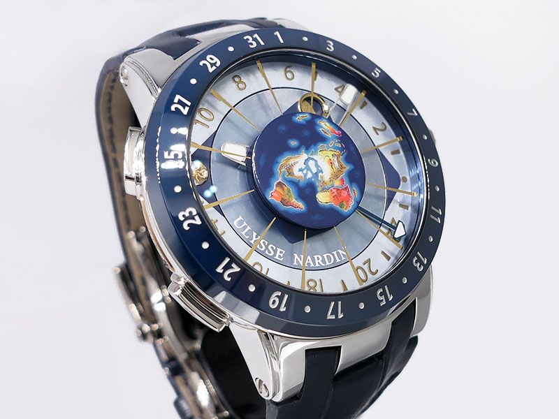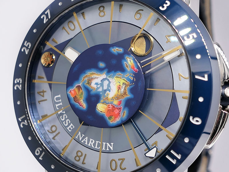 hand-painted earth over a mother-of-pearl dial that indicates the