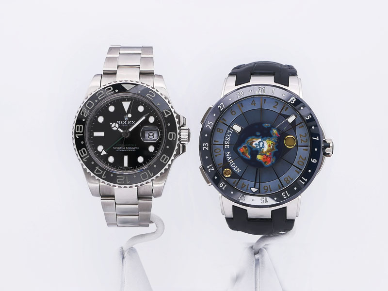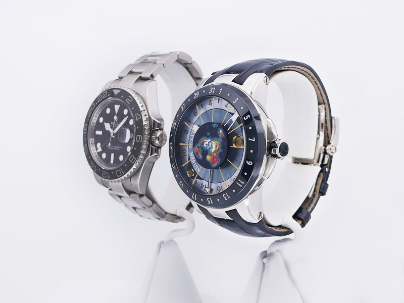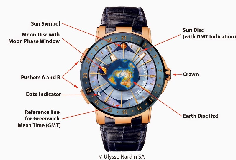 numerals, White gold skeletonized hands with luminous filled tips. Astronomical, moon phases, dual time zone/GMT, time zone adjuster,