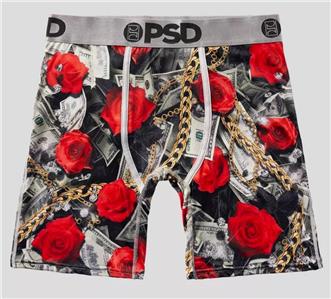 PSD Gold Chains Red Roses Long Boxer Briefs. Flatlock stitching. Double layer front. Crisp clear graphics, 7" inseam. Fabric is 90% polyester, 10% elastane. Men's sizes.