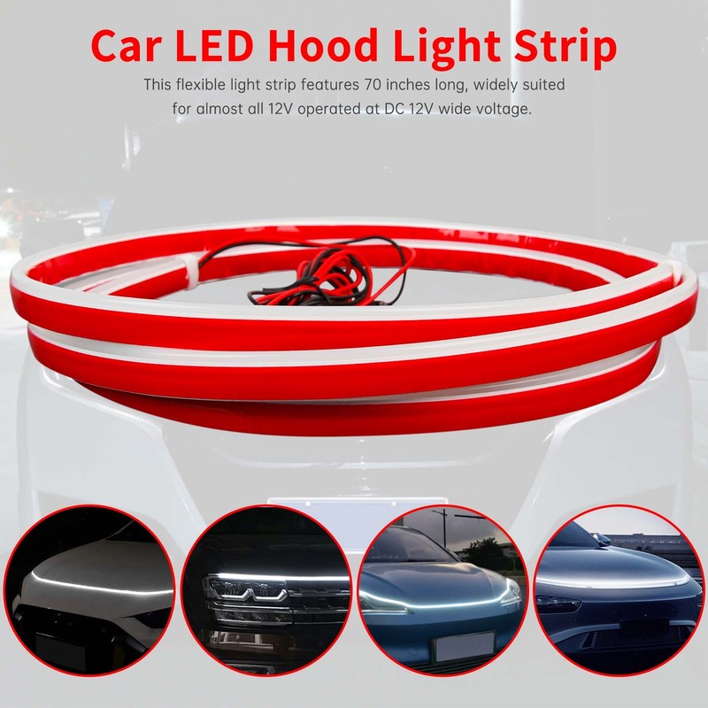【Wide Application】This Red Car Led Hood Light Strip is 70.8inch/180CM/1.8Meters,suitable for all 12Volt cars ,trucks ,SUVs, Vans, Jeep,can work as Engine Cover Decoration light,Car grill light strips,daytime running lights,Car ambient light,license plate lights,pedal lights,Boat Light strip.,Pickup Truck Tailgate Light Strip.