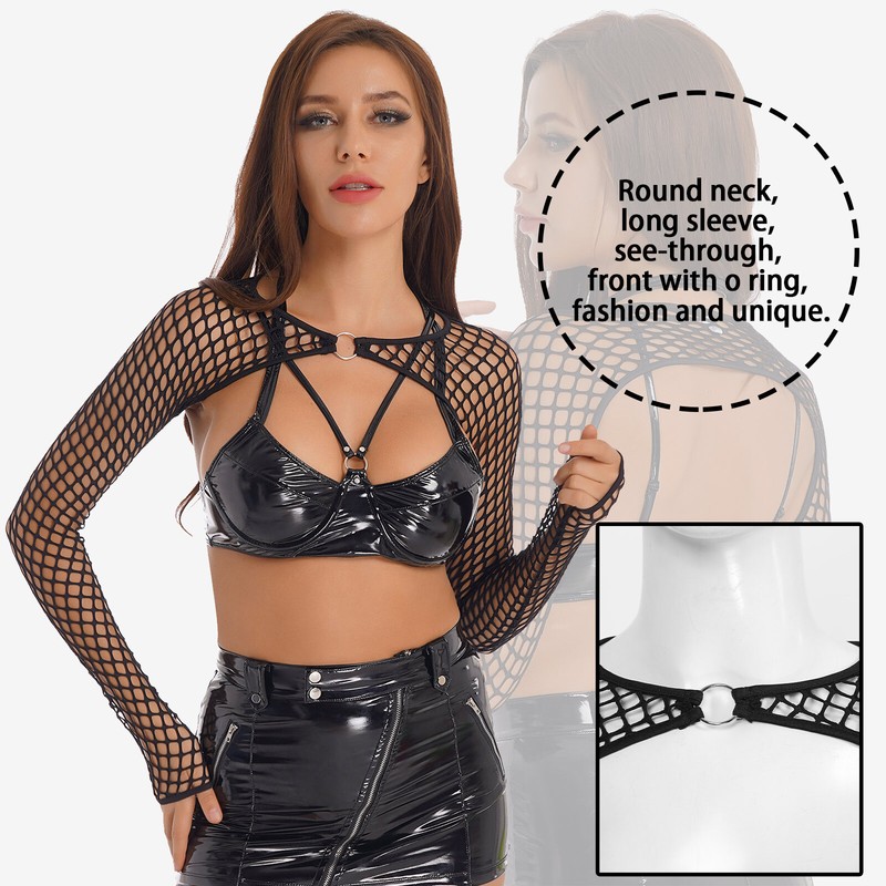 Womens Hollow Out Fishnet Crop Top Cover Ups O Ring Long Sleeve T-shirt.
