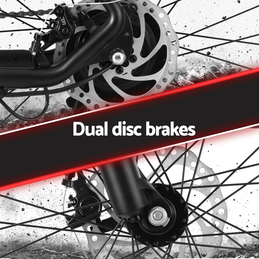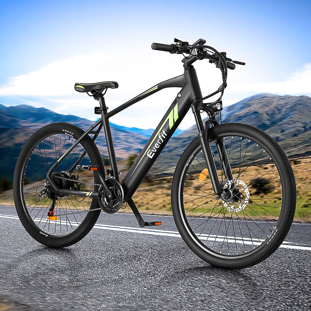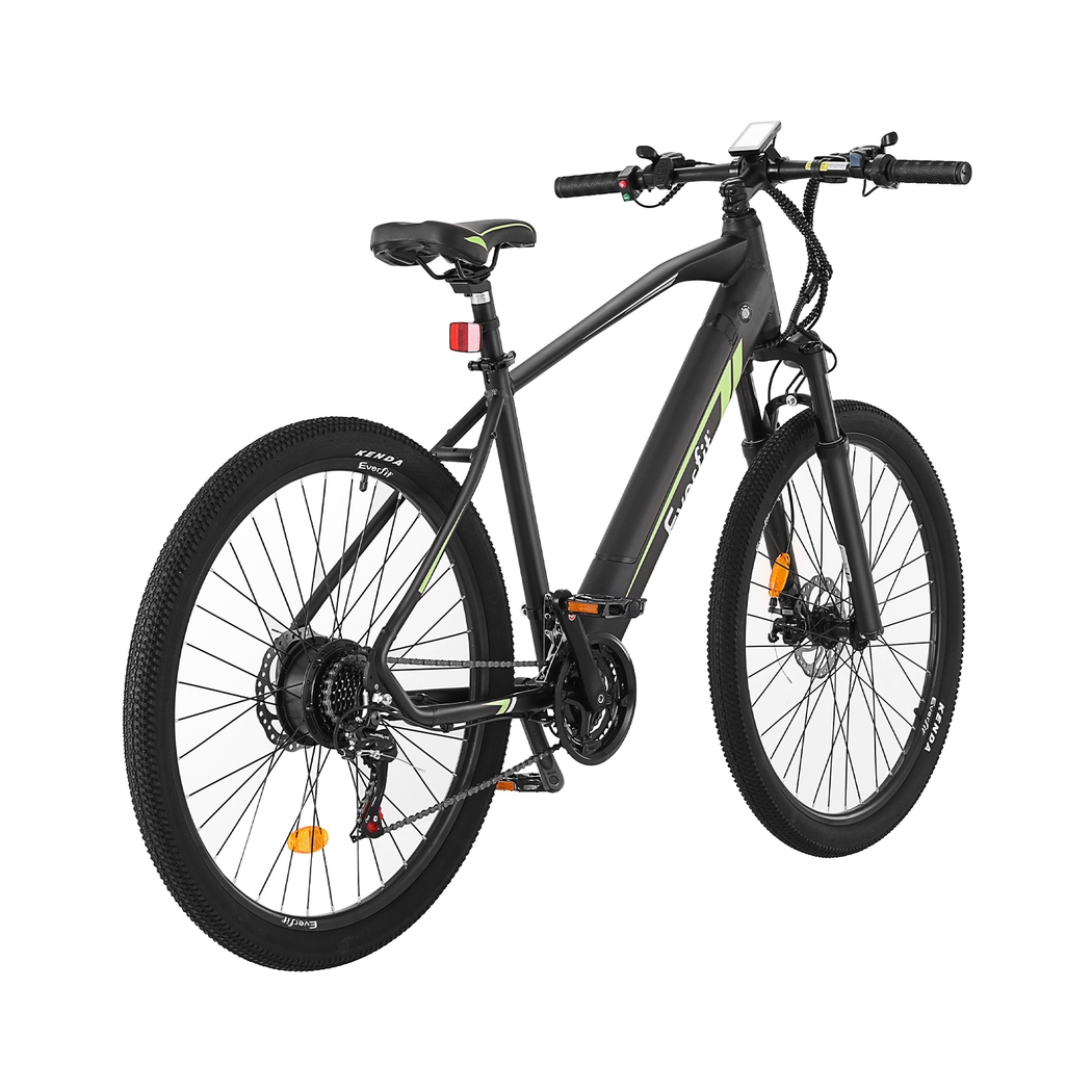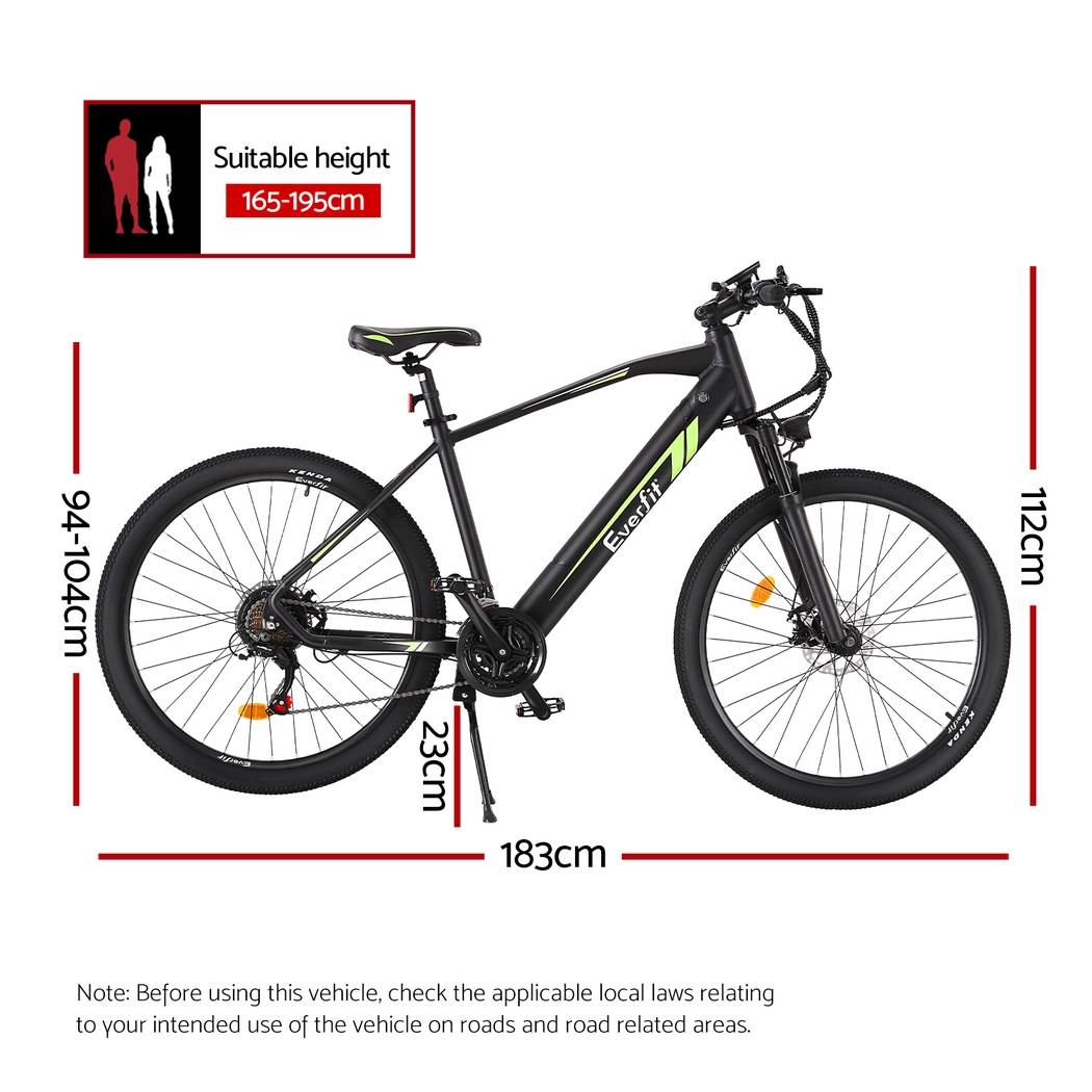 frame bike is easy to assemble, water-resistant, and perfect for mountain biking or exploring urban roads. The powerful 250W motor is paired with SHIMANO 21-speed gears and derailleur, making any terrain easy to tackle. With a 36V 10.4Ah removable rechargeable Li-ion battery, enjoy speeds up to 25km/h and a range of up to 60km on a single charge. Stay informed with the smart LED display panel and travel comfortably with the suspension front fork, height-adjustable saddle, and front and rear disc brakes. Our electric bike even comes with a built-in headlight and reflector for safe riding, while the durable wheels and tyres provide a smooth ride on a wide range of terrains. Suitable for riders with heights between 165-195cm and a weight capacity of 120kg. Charge time is between 6-8 hours. Get your electric mountain bike today for an unforgettable ride.