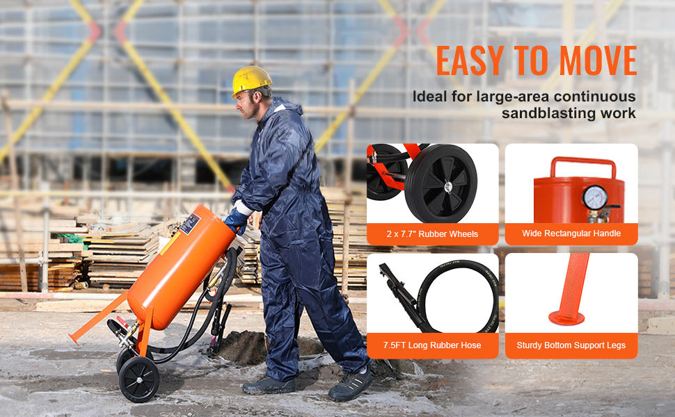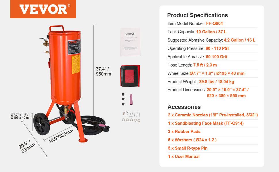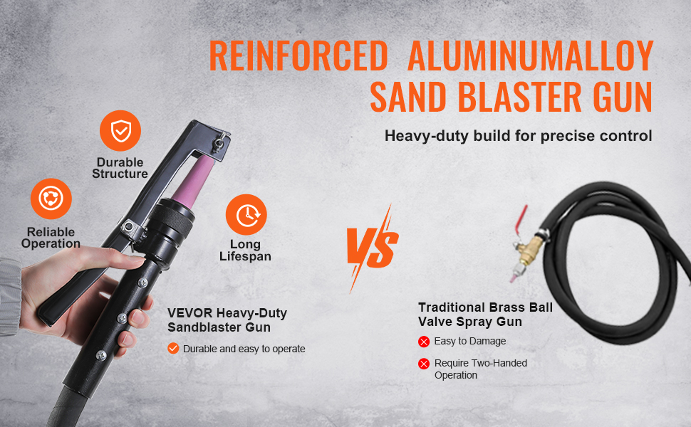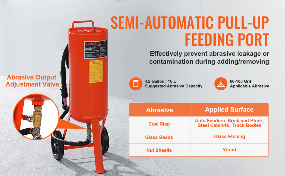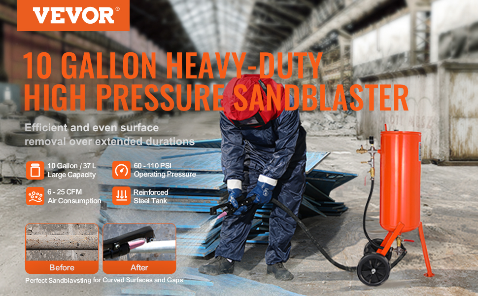 Choose VEVOR 10-gallon heavy-duty sandblaster and experience a simpler, more efficient, and precise surface treatment. It enables high-pressure surface treatment, effortlessly removing rust, paint, stain and polishing large areas, also performing perfect sandblasting for curved surfaces and gaps.