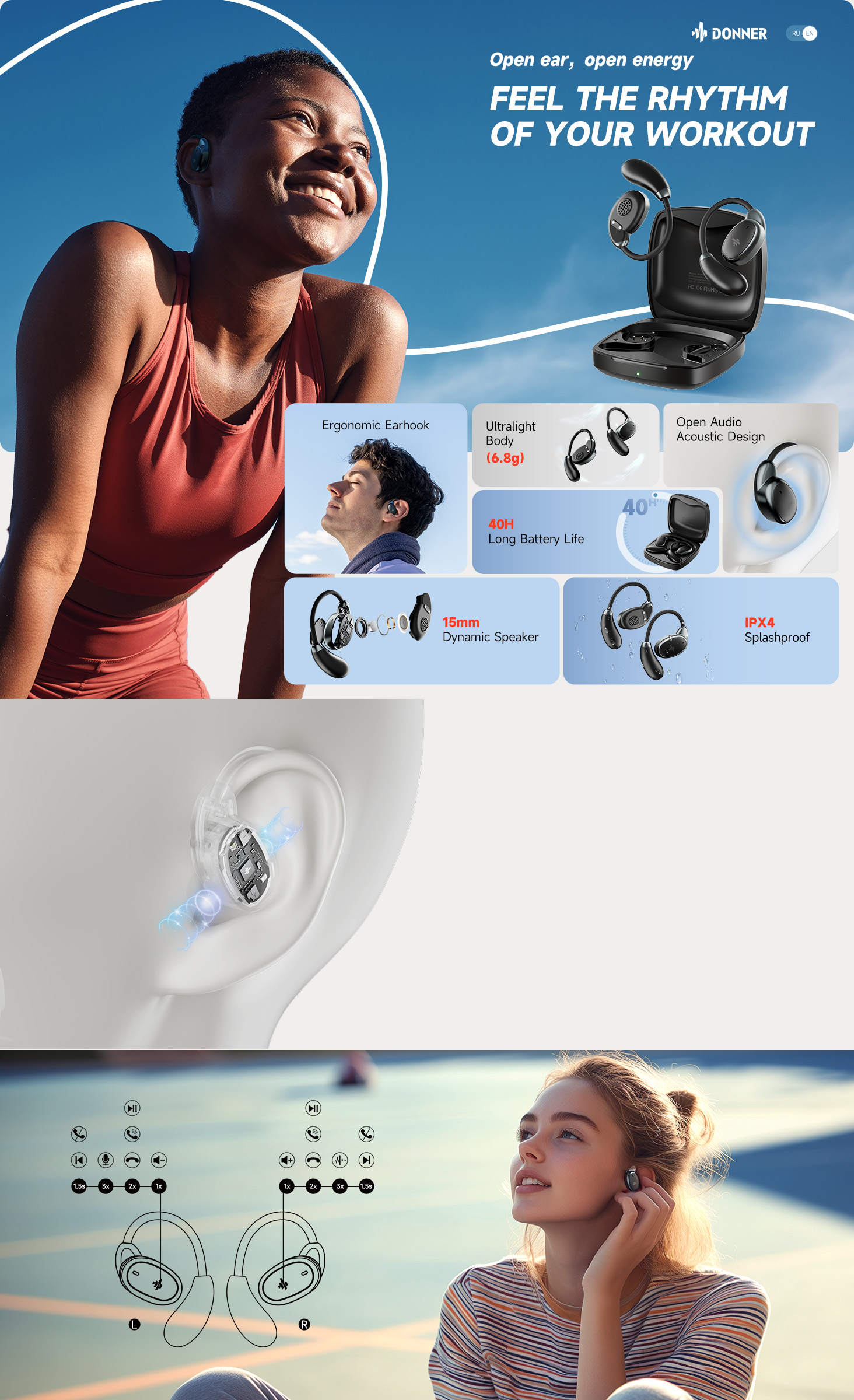 【 Ultimate Comfort, Secure Fit 】Donner open ear earbuds feature a non-intrusive design and soft, flexible ear hooks for a perfect fit, ensuring that you can wear them all day without discomfort, skin-friendly silicone material also avoids any potential pain. Suitable for outdoor leisure, sports, office work, driving, and home entertainment.