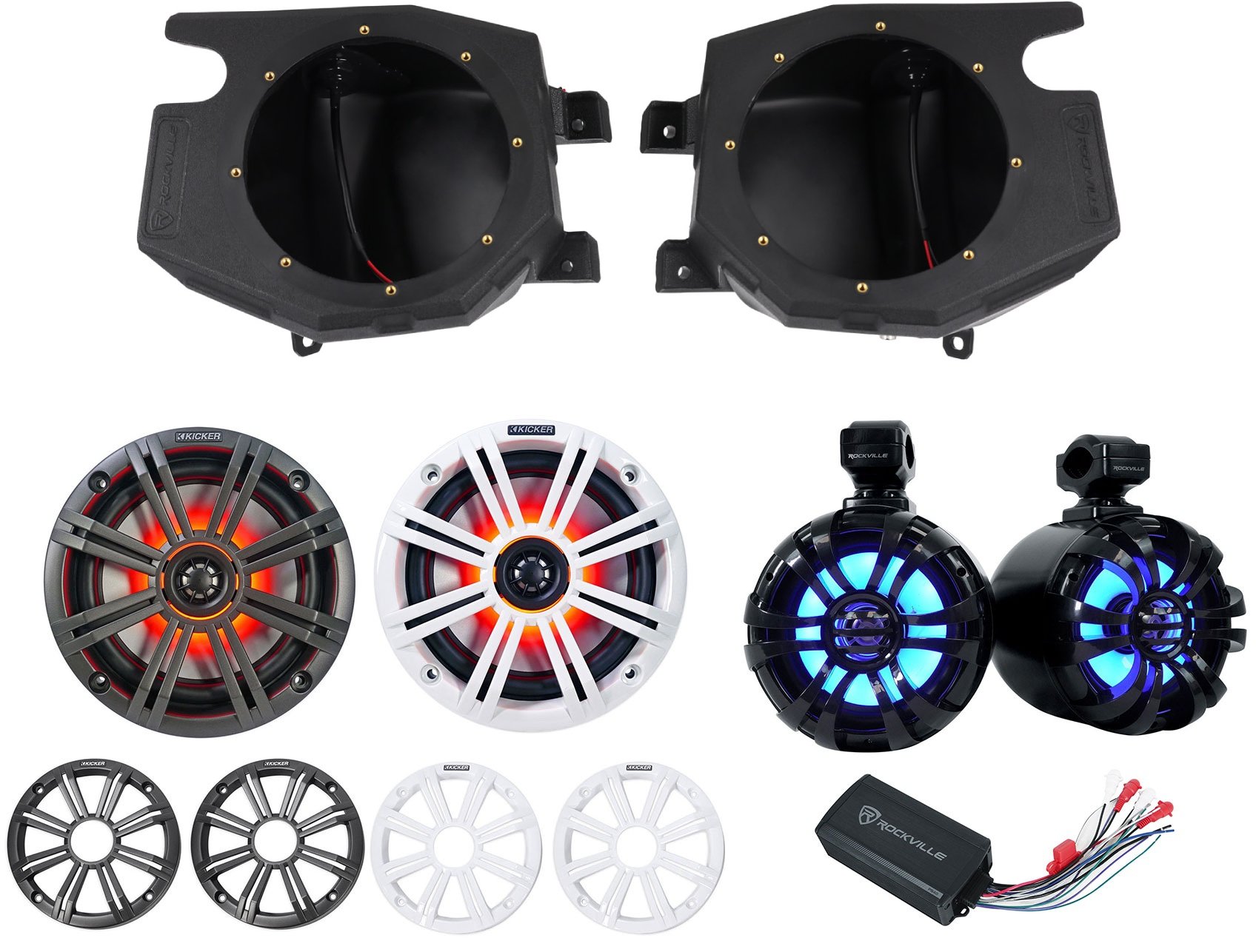 Package Includes: (1) Rockville RockZR v2 2014-2023 Polaris RZR Front Kick Panel 6.5" Speaker Pods+(1) (2) KICKER 45KM654L 6.5" 390w Marine LED Speakers w/Charcoal+White Grilles KM65+(1) Pair Rockville WB65KLS BLACK 6.5" 300w Metal Marine Wakeboard LED Tower Speakers+(1) Rockville PS40 4 Channel ATV/UTV/Motorcycle Bluetooth Amplifier IP65 Micro Amp