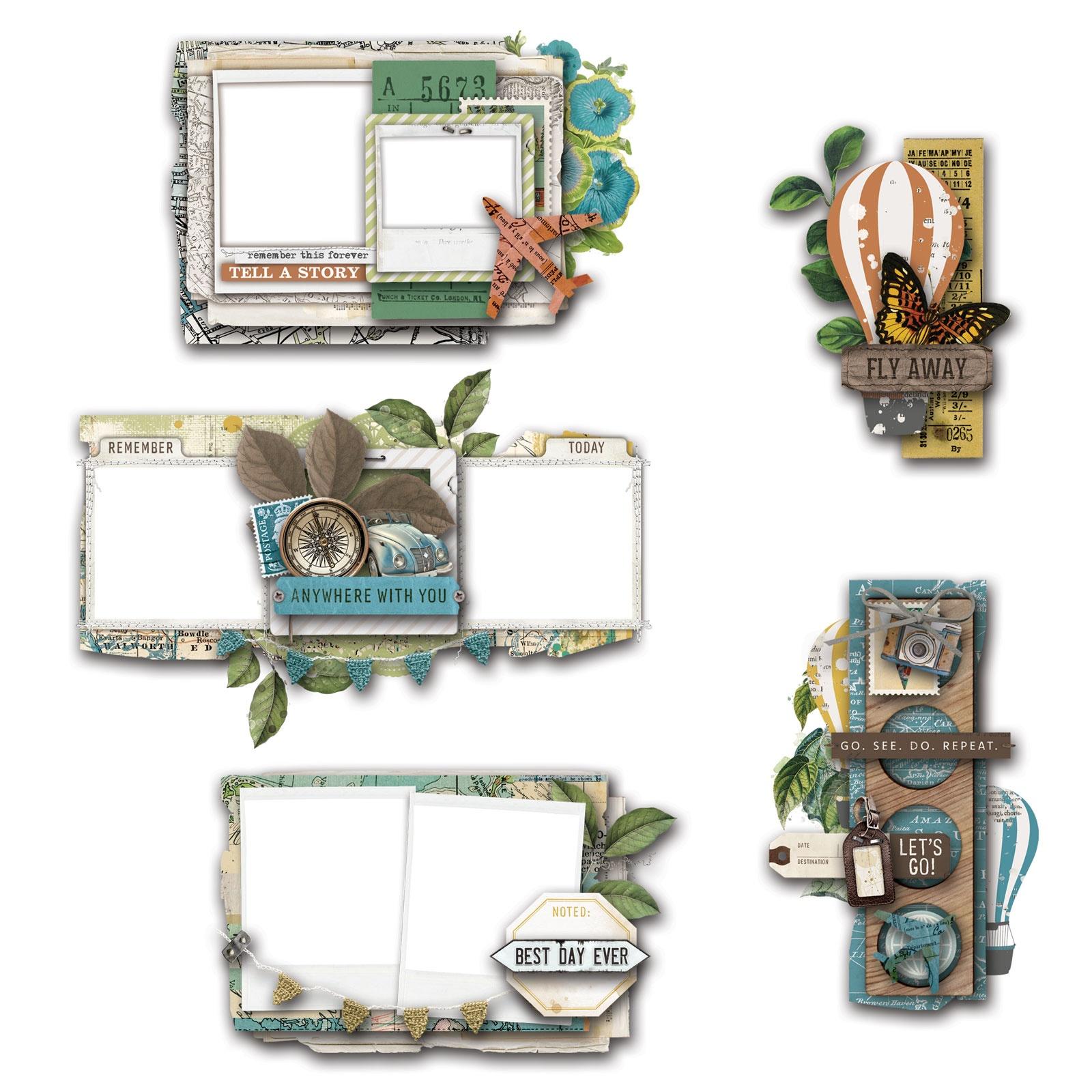 Get a taste for all of our bits and pieces and how easy they can be mixed together to create amazing starting points for all of your crafting projects. This set includes 4 sheets of 6x12 inch laser cut elements; 1 sheet of 6x12 inch adhesive backed thin chipboard elements; 1 sheet of 6x12 inch Washi Tape stickers and 3 pieces of die-cut epehemera. Sample images show 5 complete cluster or mix your own assortment to suit your needs.