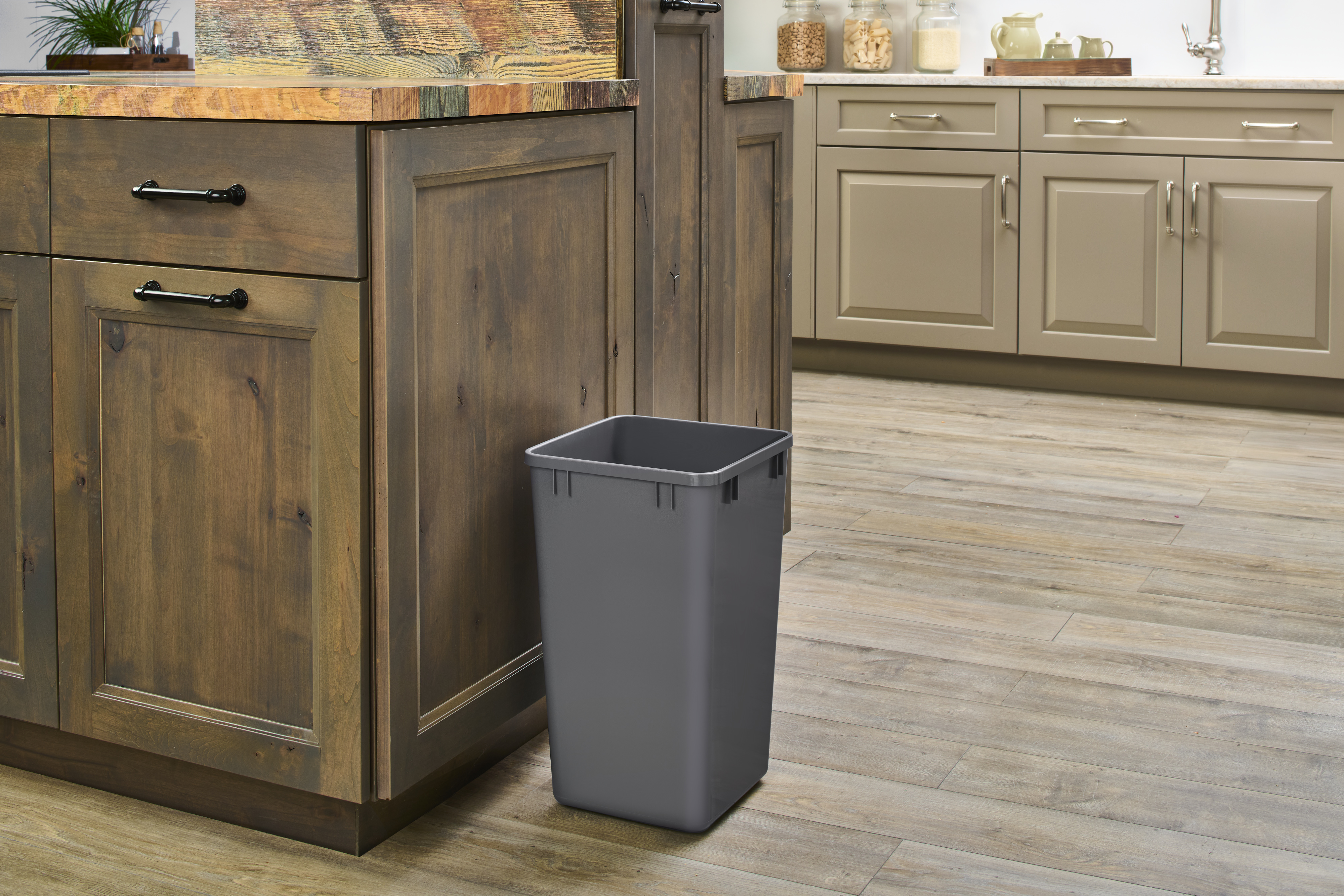 Made of injection molded polymer plastic for increased durability, the double waste containers will be an ideal addition to your home to hide away the trash and ensure your kitchen smells fresh at all times. Though designed to work with all of the Rev-A-Shelf waste containers and trash Pullouts, they can also be used to hold extra trash or recyclable items no matter where you need them, whether it be inside or outside. The 27 qt. capacity will keep you from having to empty the basket numerous times a day for ultimate convenience. With a neutral orion gray color, these modern waste bins will fit perfectly inside your cabinets or can be left out and placed beside a kitchen cabinet, bedroom dresser, or bathroom sink.