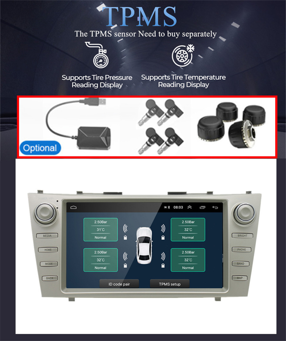 passengers. - Setup: Auto Answer, Auto connect, Device name - Built-in Microphone: Yes, on the front panel - External Microphone Jack:Yes on the RCA cable - FM Area: Europe/USA1/USA2/Japan/Russia - RDS:On/Off - Support TPMS: YES (Not Included) -Support Steering Wheel Control;Yes -1 x Car Radio Stereo With Frame -1 x GPS Cable -2 x USB Cable -1 x RCA Cable -1 x Camera Input Cable -1 x Panel Connection Cable -1 x User 's manua NOTE Specifications