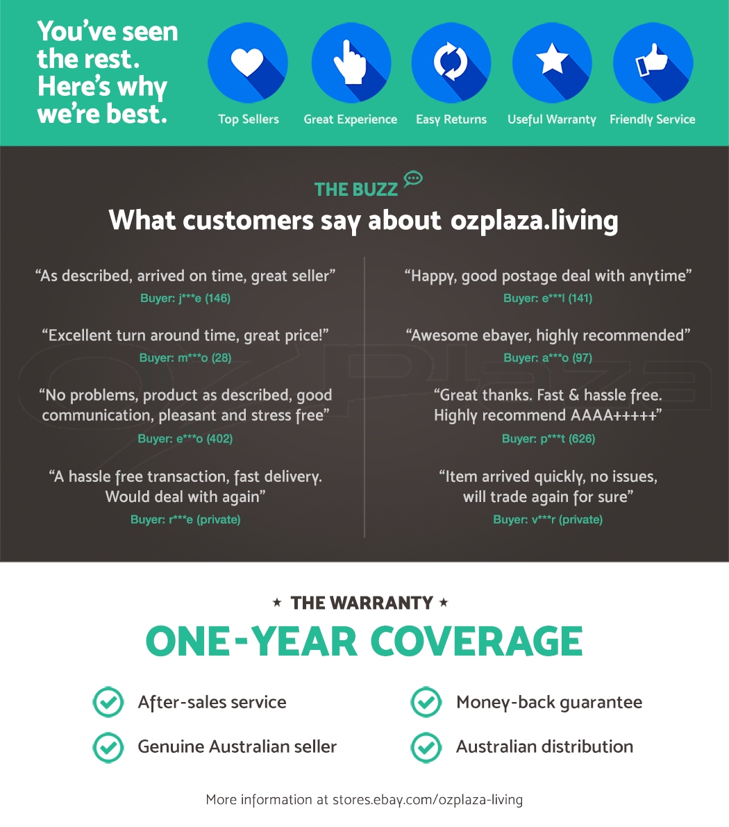 For your peace of mind, this product comes with a 1-year warranty. We value our customers and wish to make your purchase experience as enjoyable as possible. If something goes wrong with your product, please do not hesitate to contact us for assistance. Please CLICK HERE for full terms and conditions that outline your warranty rights.