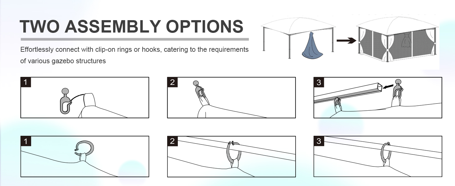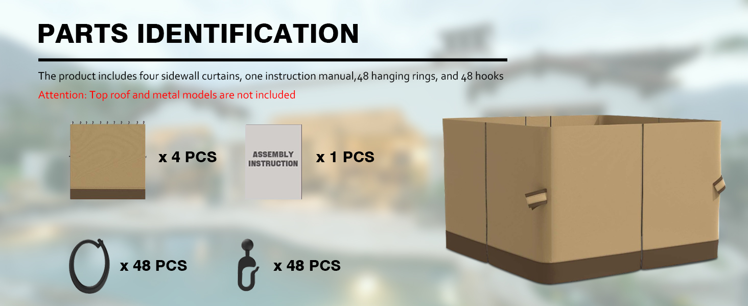 【NOTICE】There is only 4-panel curtain, top roof and gazebo are not included. 10 x 10 FT Package also includes 40 pcs hooks, 40 pcs rings(for square or round tube maximum 1 inch diameter tube), 4 pcs 5.9inch straps and an instruction. 10 x 12 FT /10 x 13 FT Package also includes 44 pcs hooks, 44 pcs rings(for square or round tube maximum 1 inch diameter tube), 4 pcs 5.9inch straps and an instruction. 10 x 10 FT Package also includes 56 pcs hooks, 56 pcs rings(for square or round tube maximum 1 inch diameter tube), 4 pcs 5.9inch straps and an instruction. If you have problems during installation or use, please contact us.