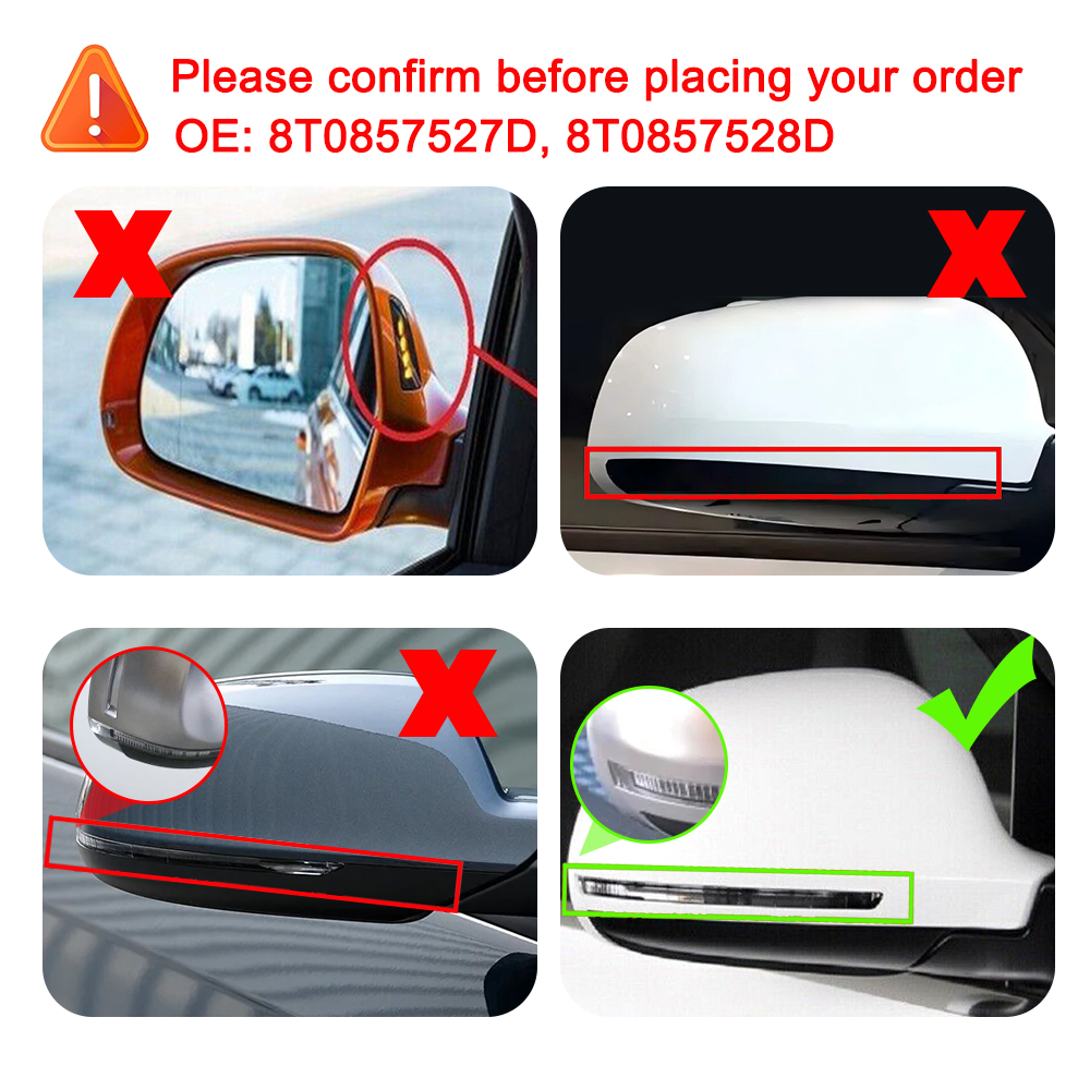 Unsere Rückspiegelabdeckungen sind für Spiegel konzipiert, die ursprünglich mit Blinkleuchten ausgestattet waren. Bitte überprüfen Sie vor dem Kauf die Position und Form der Blinkleuchten. Unsere Blinkleuchten befinden sich im unteren vorderen Bereich der Spiegelabdeckung und sind als horizontale Streifen ausgeführt, die nicht bis zum hinteren Ende der Abdeckung reichen. Bei einigen Fahrzeugen mit Facelift sind die Blinkleuchten abgewinkelt und reichen bis zum hinteren Ende der Spiegelabdeckung. Unser Produkt ist für solche Modelle nicht geeignet. (Siehe Abbildung.)