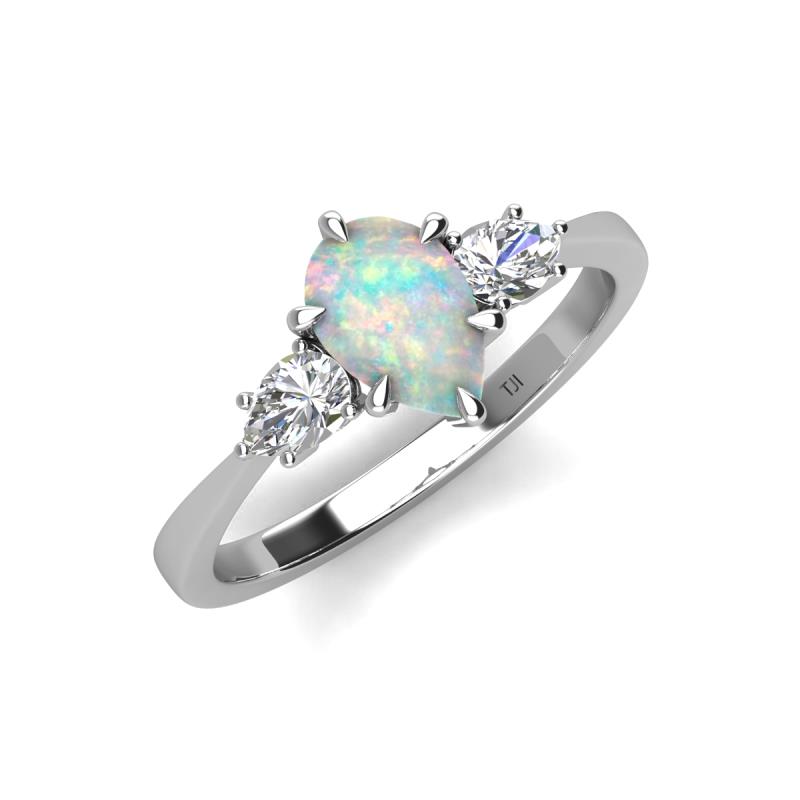 Pear Shape (9x6 mm) Opal and Diamond 1.07 ctw Tiger Claw Set Six Prong Women Three Stone Engagement Ring 14K White Gold