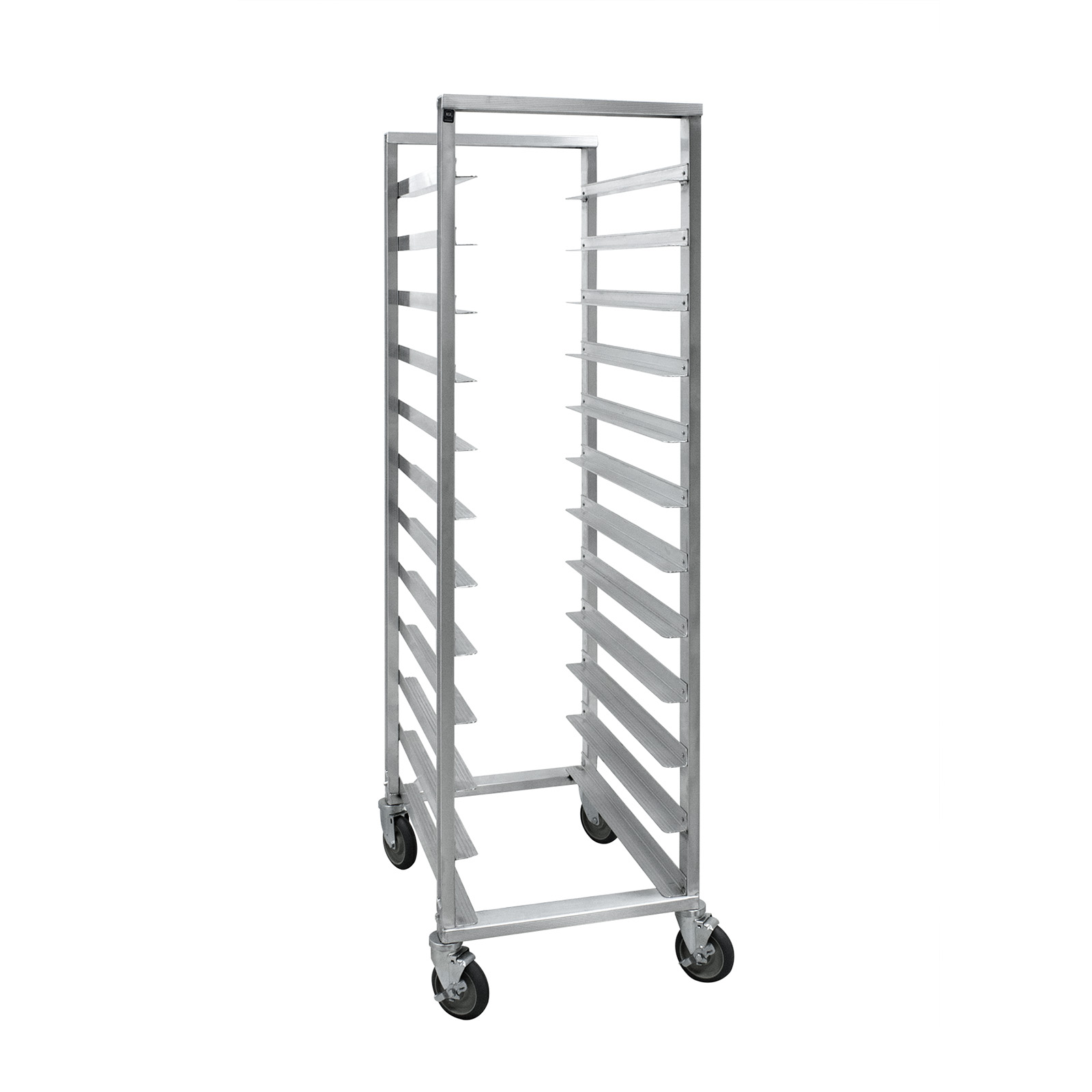 Utility Rack, mobile, angle ledge, full height, open sides, riveted pan slides with extruded angles, 5-1/8" centers, (24) 14" x 18" tray or (12) 18" x 26" pan capacity, end loading, fully welded Hi-Tensile aluminum frame construction, (4) 5" swivel casters (2) braked, NSF