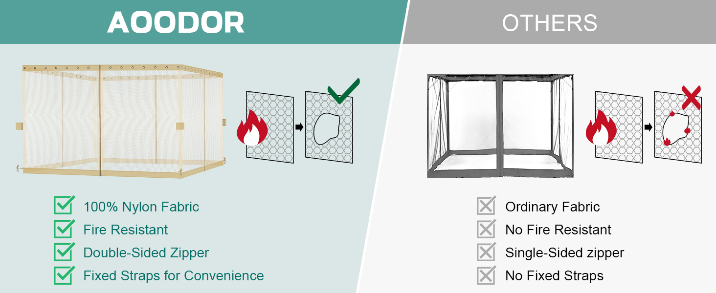 【Various Sizes】 - Aoodor gazebo mosquito netting is designed for 10x10ft, 10x12ft, 10x13ft, 12x12ft, 12x14ft and 12x16ft gazebos, ensuring a perfect fit for a wide range of gazebos