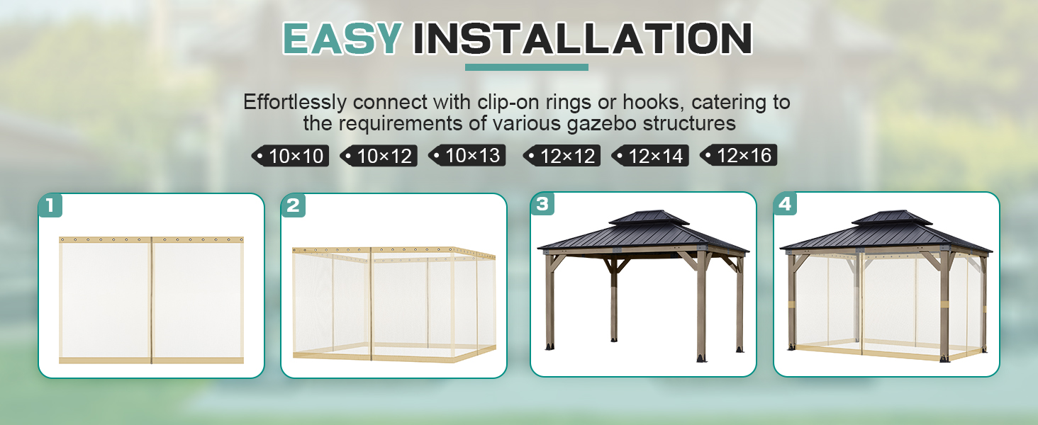 【Easy Installation】 - The package comes with C-shaped rings and hooks, allowing for hassle-free attachment to different gazebo beams for quick and easy setup