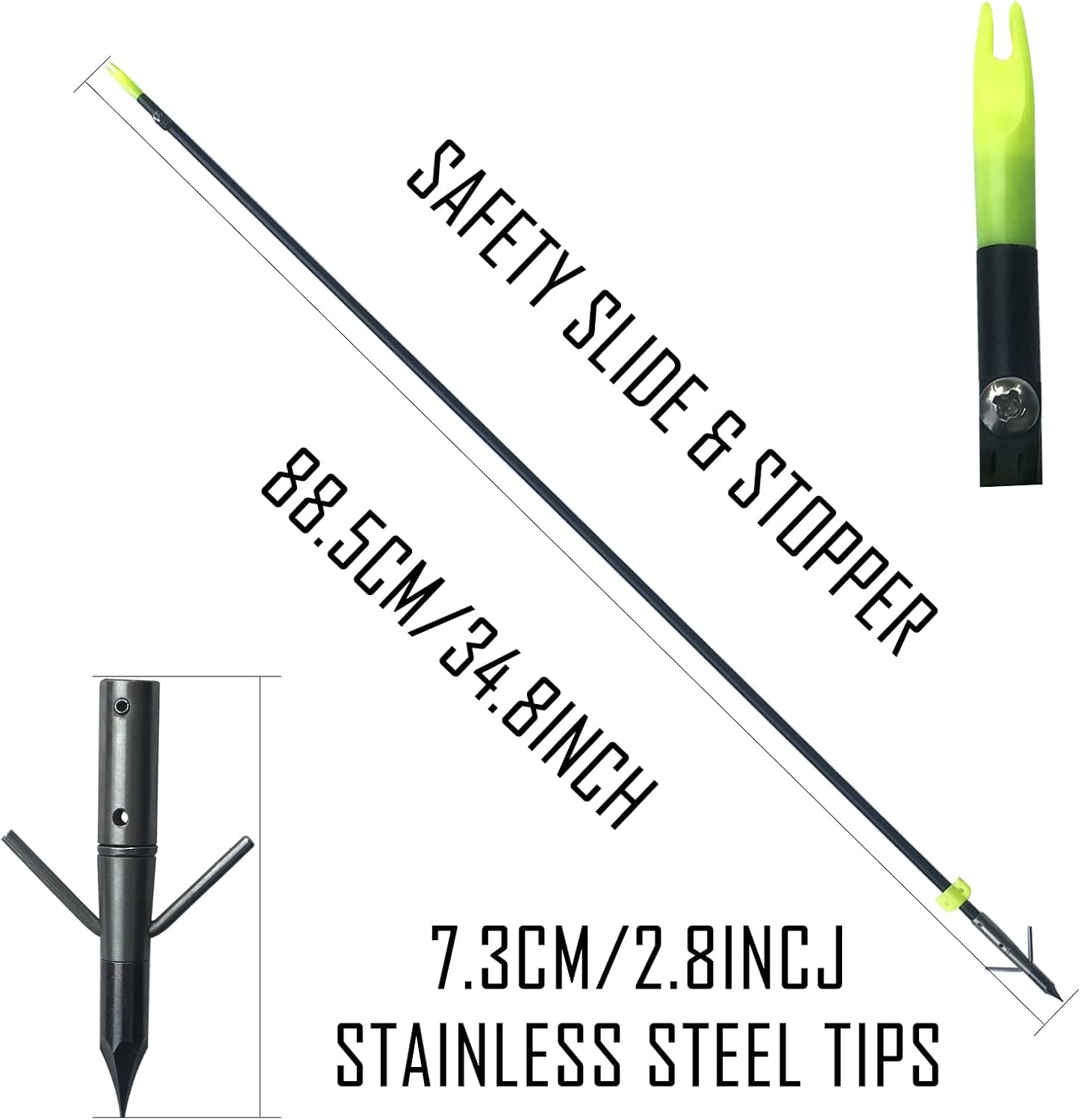 New version bow fishing arrows with safety slides and suitable for bow fishing. Simply match our fishing arrow with your bow fishing reel and you are ready to shoot.