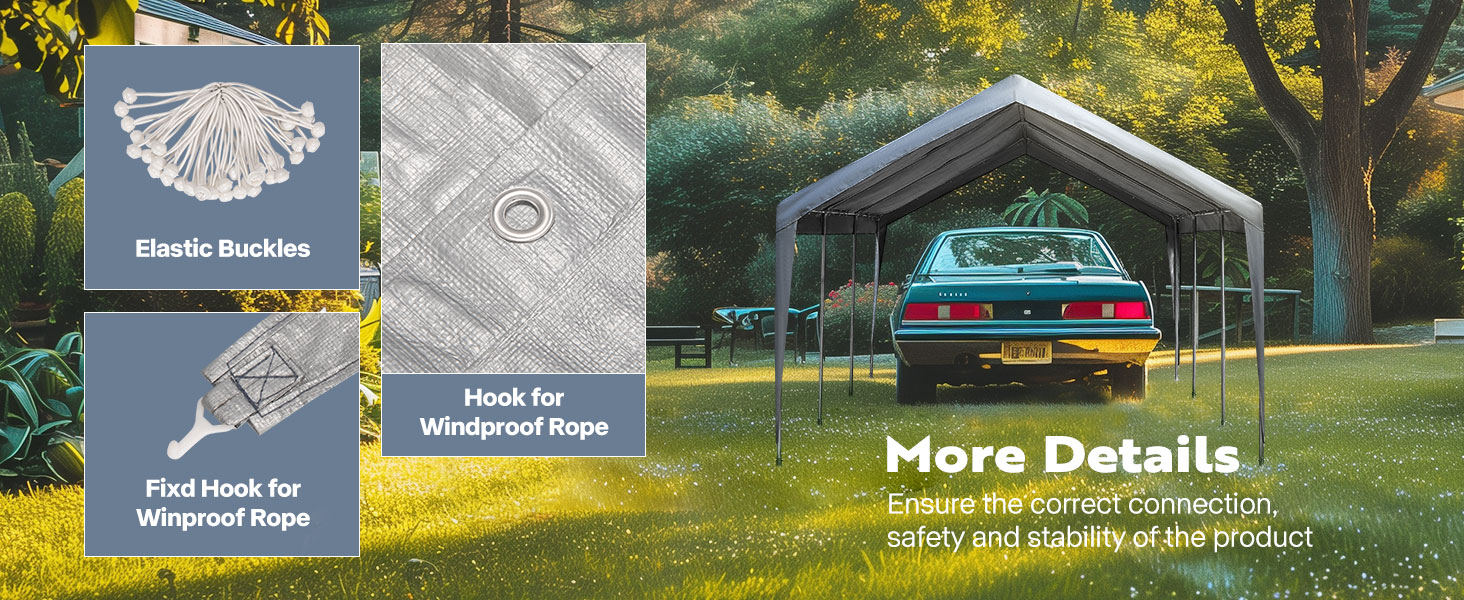 SECURE FIT - Equipped with 44 premium elastic buckles, the canopy cover provides a secure and snug fit for carports of 12x20 ft; Even in harsh weather conditions, the elastic ropes effortlessly stretch to keep the cover firmly fastened to the frame, ensuring reliable and long-lasting protection