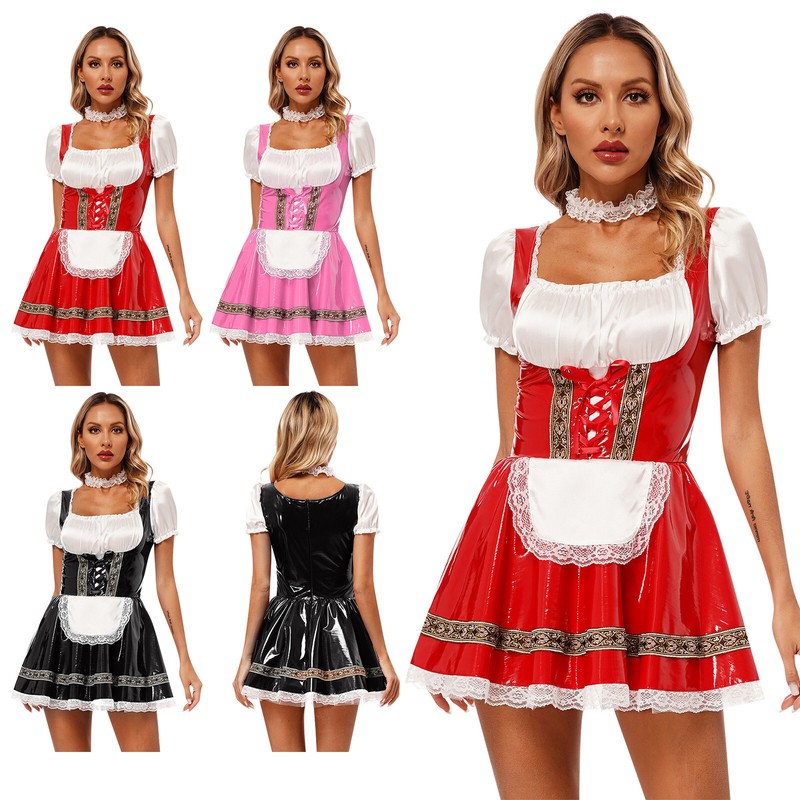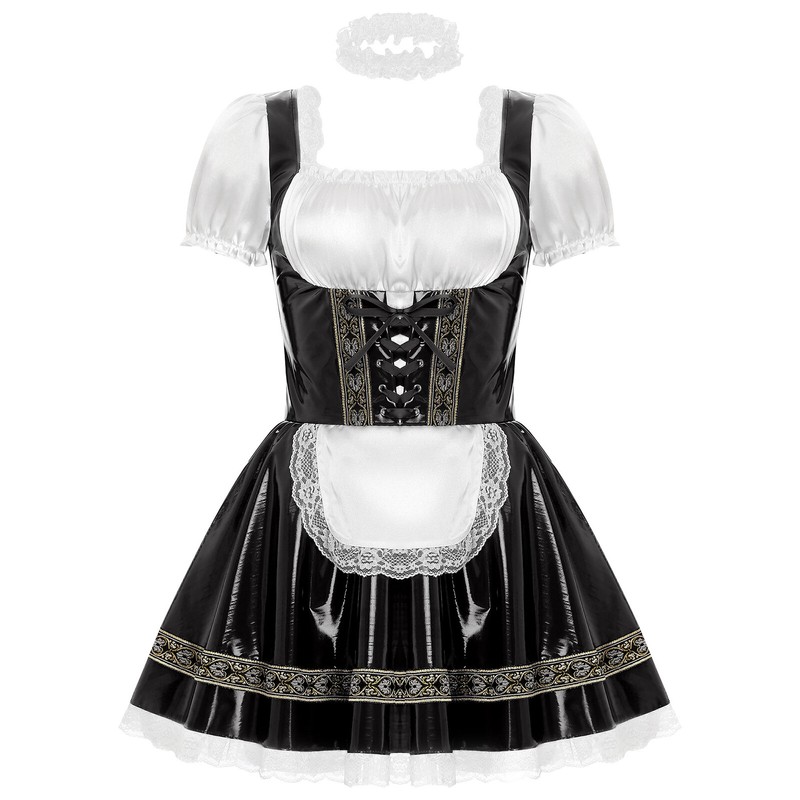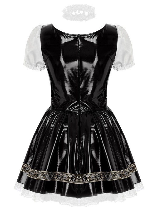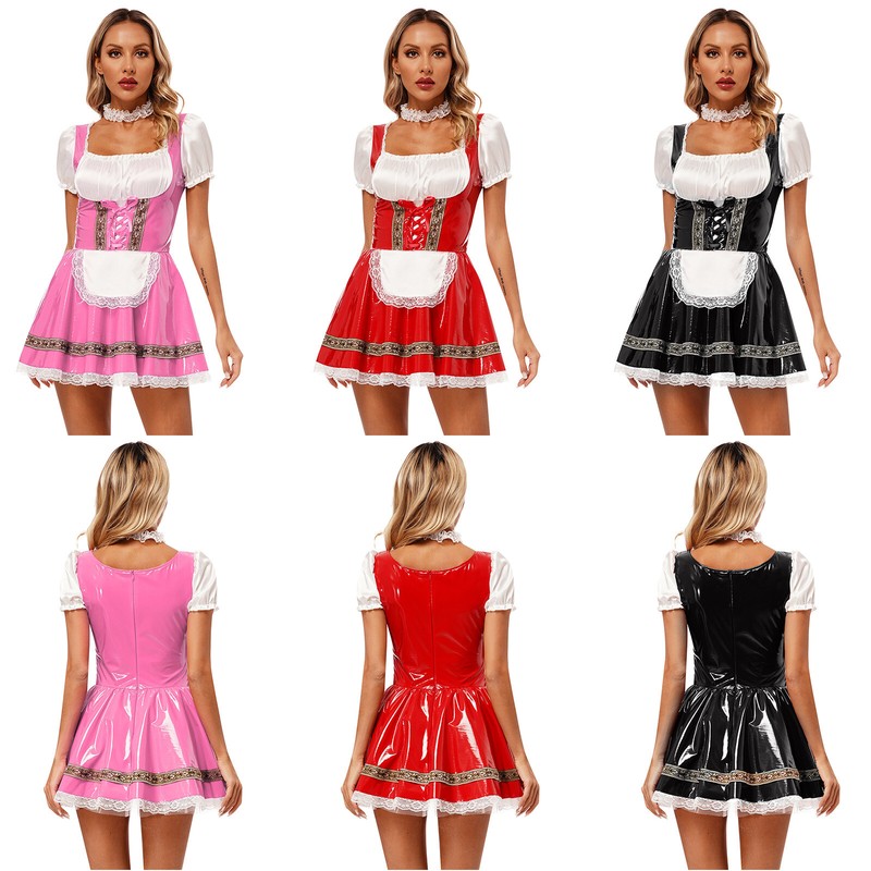 Women’s maid dress-up dress adopts satin and patent leather patchwork, integrated apron, short puff sleeve and back zipper closure.
