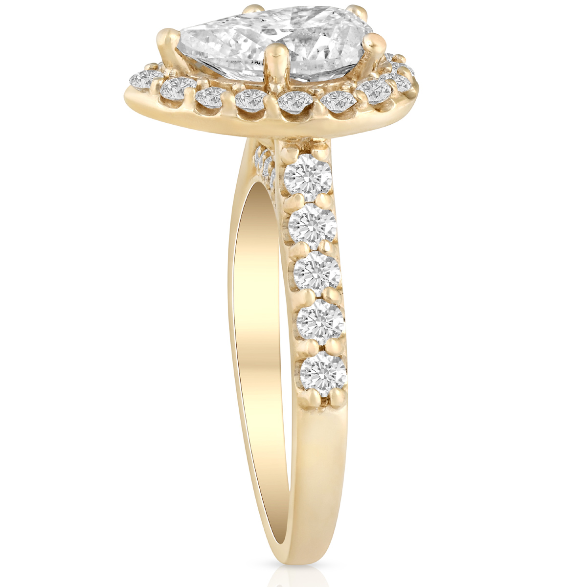 This show stopping womens ring features a 1 carat pear shape brilliant cut center lab grown diamond. The pear cut center diamond is flanked with round brilliant cut diamonds, all diamonds are set in solid 14k yellow gold high polished mounting.