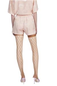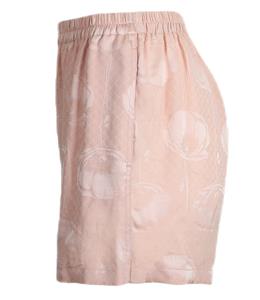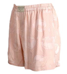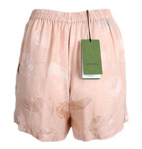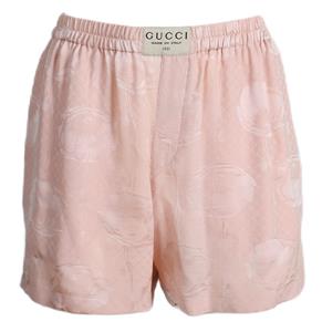 NEW WITH TAGS GUCCI LADIES PINK SILK INTERLOCKING G TEXTURE POPPY PRINT LOGO SHORTS. MADE IN ITALY. 100% AUTHENTICITY GUARANTEED. LUXURIOUS QUALITY 100% SILK SHORTS IN LIGHT PINK COLOR INTERLOCK G AND POPPY PRINT. 2 SIDE SLASH POCKETS. STREATCHY WAIST LINE WITH LOGO TAG IMBROIDERY AT THE WAIST. SIZE 40, US 6. WAIST 26-30", INSEAM 3.5".