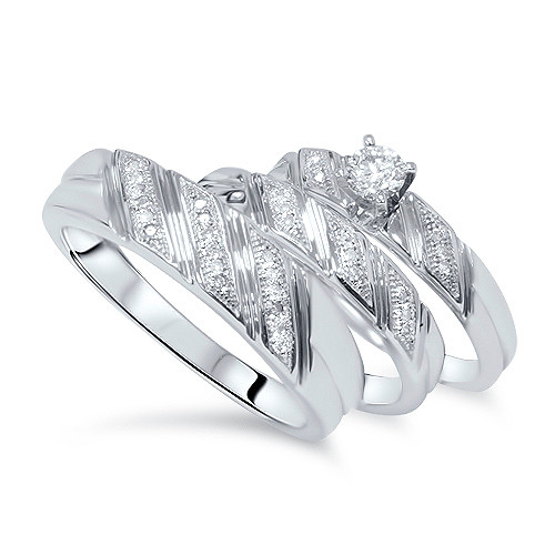 This ring set features a matching mens and ladies diamond ring. The engagement ring has a 1/6ct center stone. The diamonds are set in solid 10k white gold. Womens engagement ring has matching band. The style is unique it has