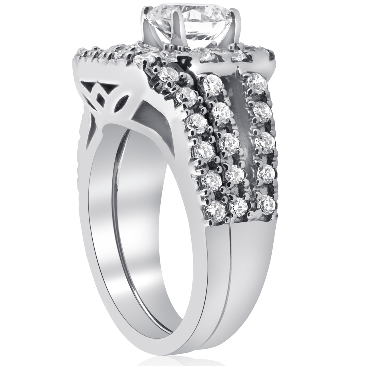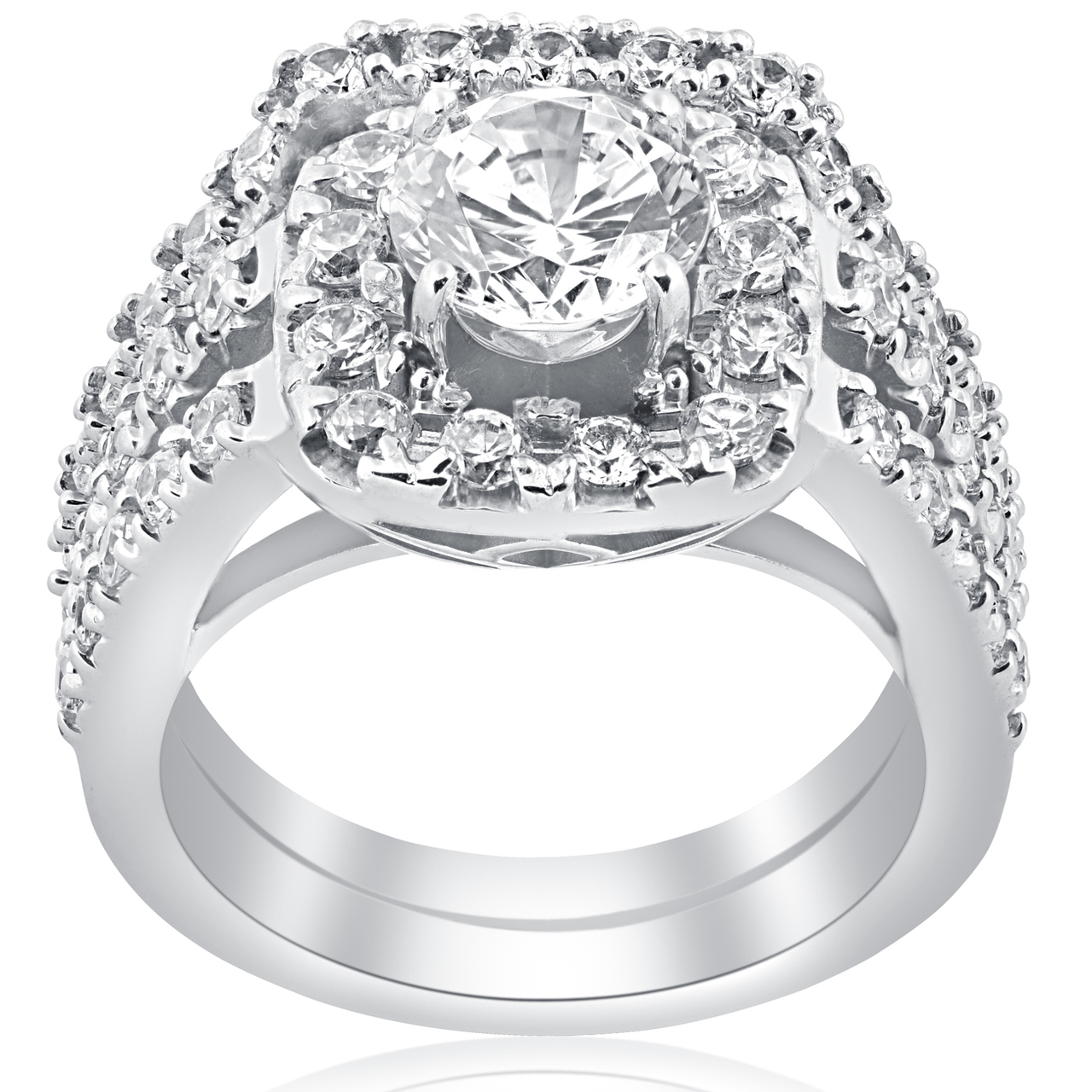 Womens cushion halo engagement wedding ring set features a 1 carat round brilliant cut clarity enhanced diamond. The rings are flanked with 49 round cut genuine diamonds. All diamonds are prong set in solid 14k white gold high polished mountings. Matching curved guard wedding ring is included.