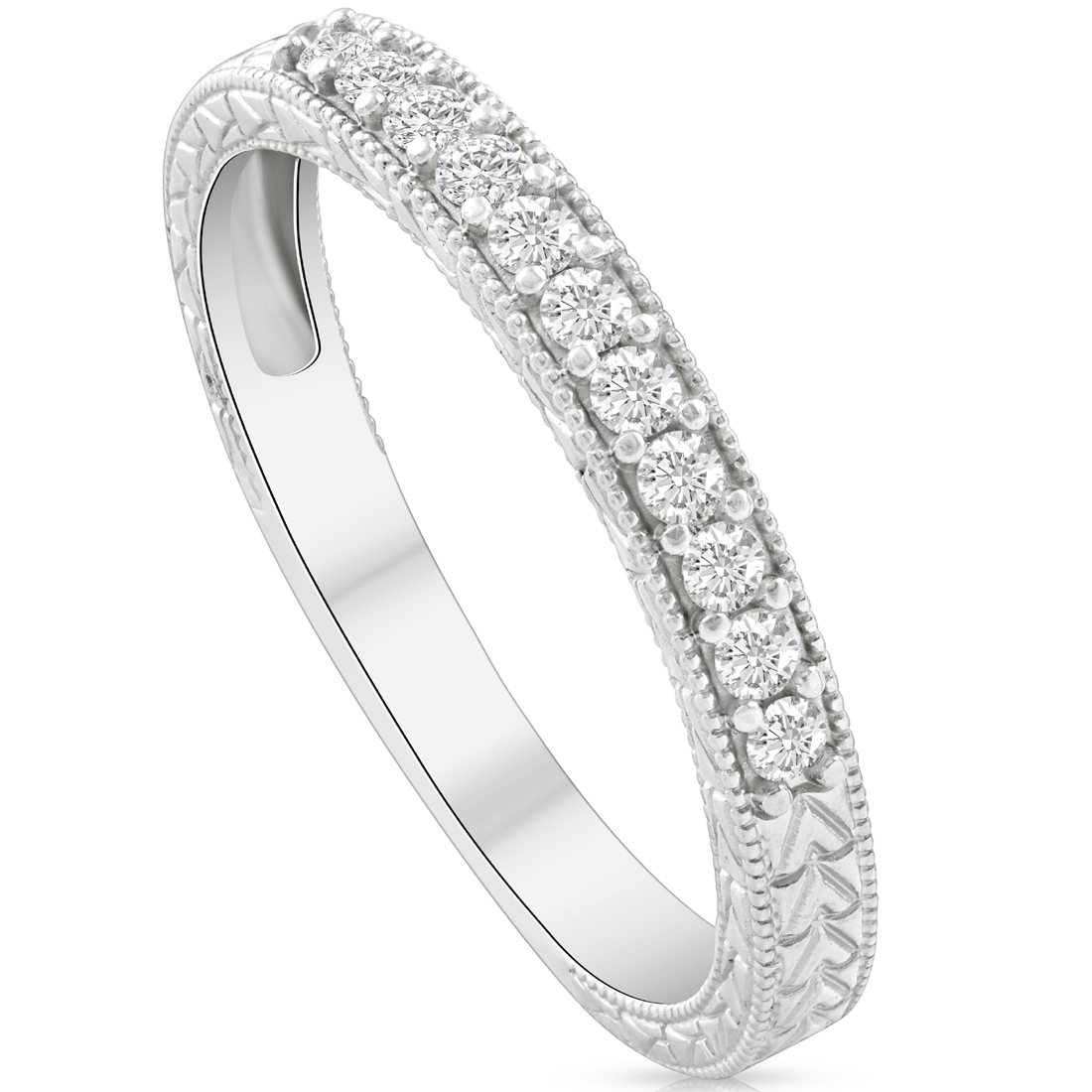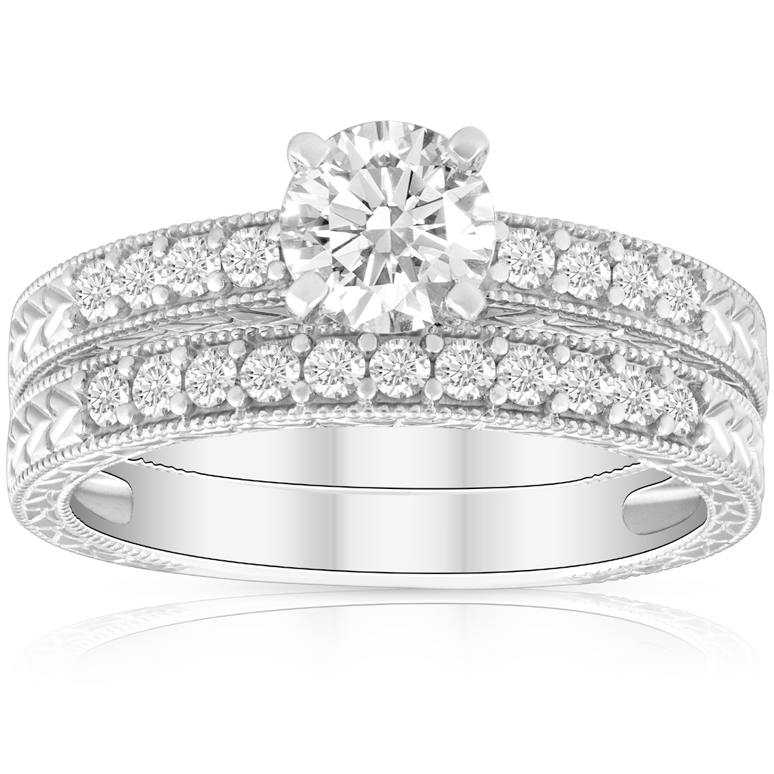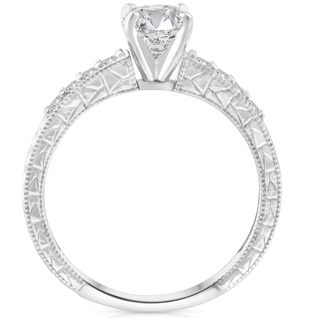 Womens ring features a 1 carat round brilliant cut lab grown diamond. The rings are flanked with 21 round cut accent diamonds. All diamonds are set in solid 14k white gold. The rings feature hand engraved vintage style accents.