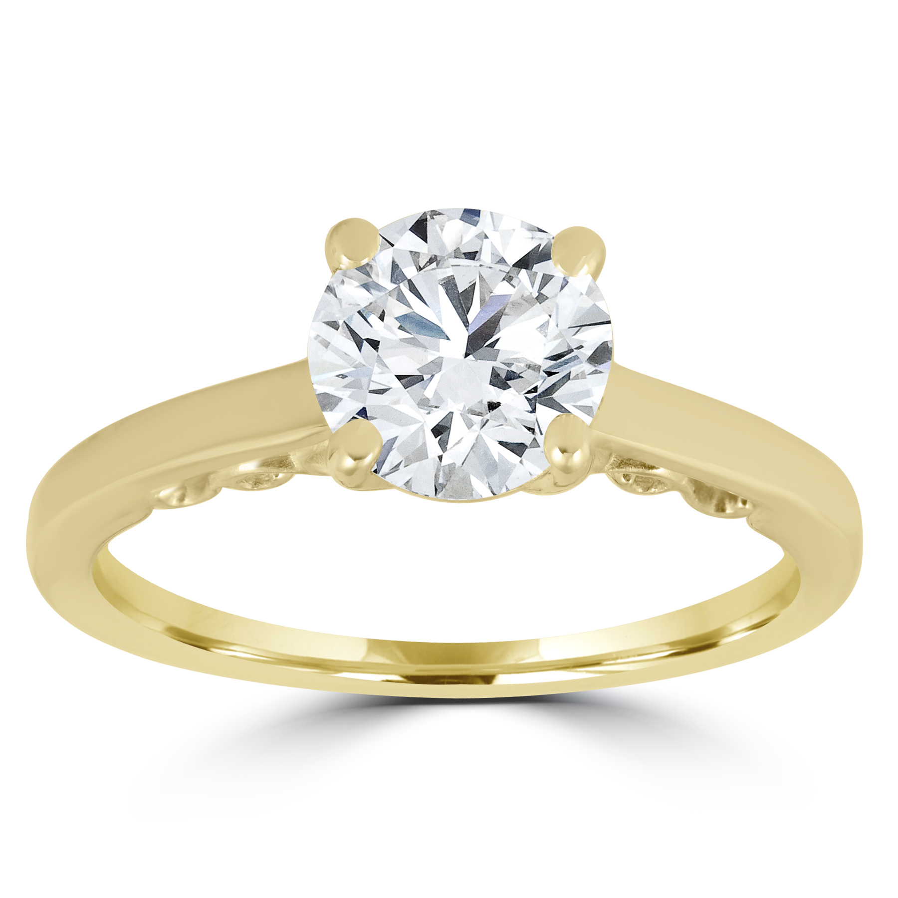 Womens ring features a 1 carat round brilliant cut clarity enhanced diamond and two accent diamonds under the center stone. All diamonds are set in solid 14k yellow gold.