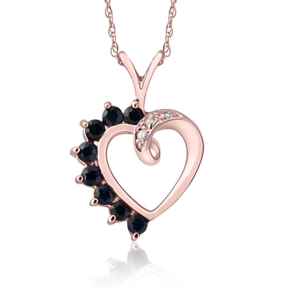 This classic heart pendant features eight round brilliant cut natural blue sapphires and three diamonds. All stones are set in solid 14k rose gold. An 18" 14k rose gold clasp lock chain is included.