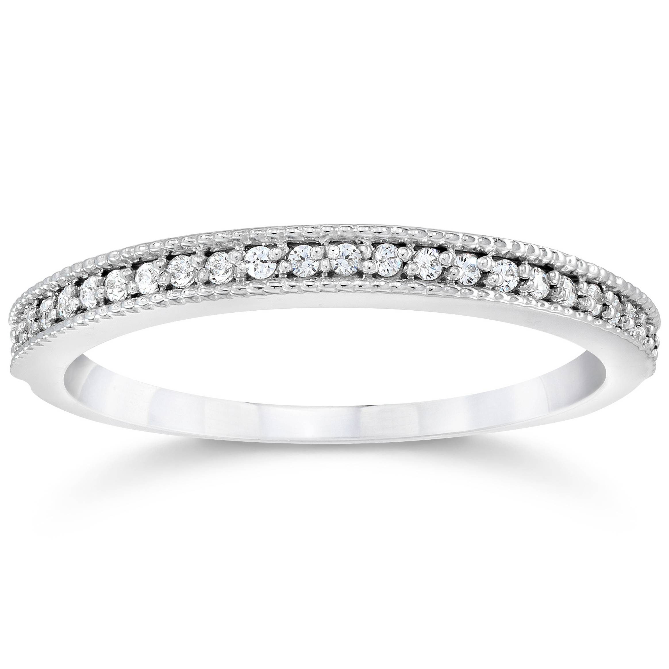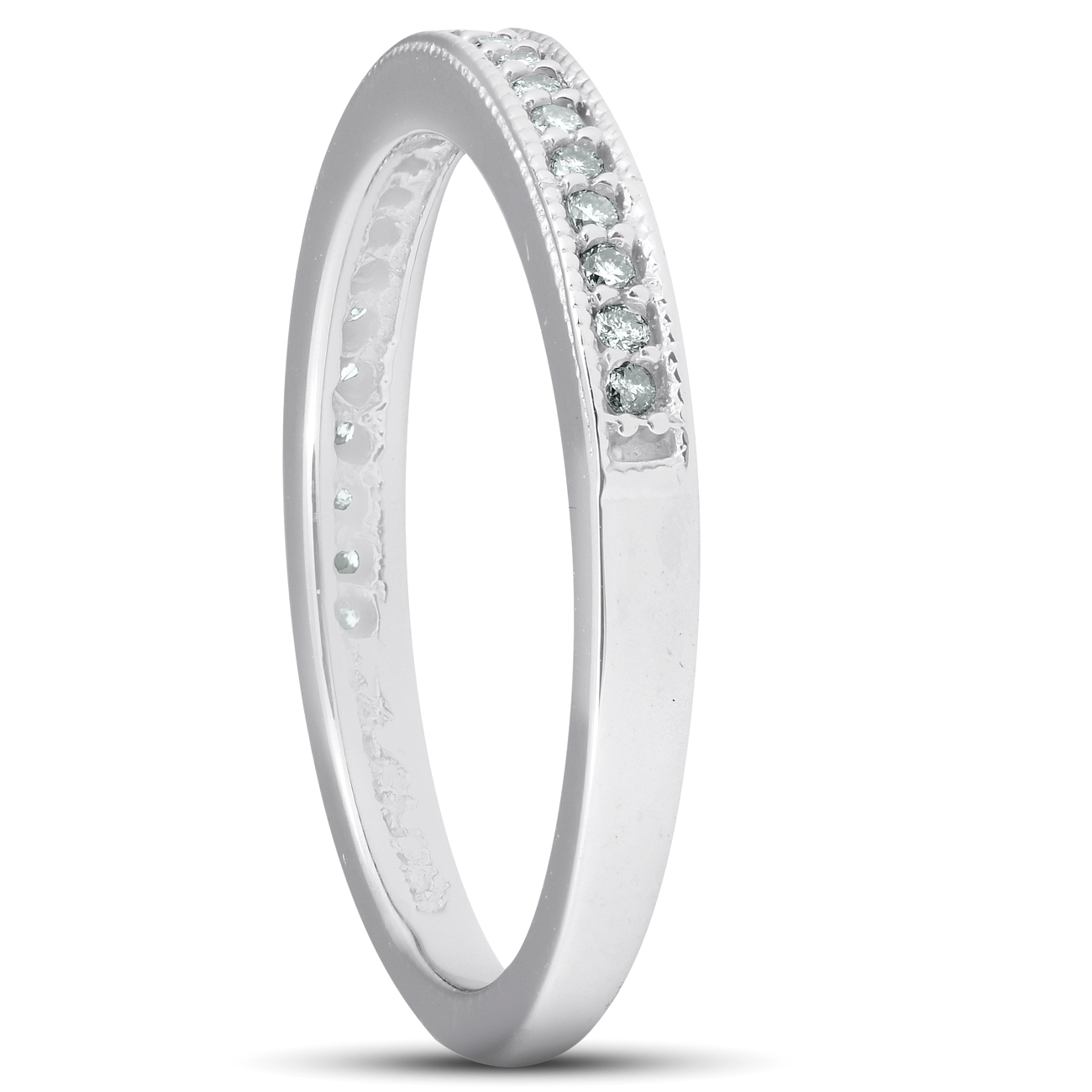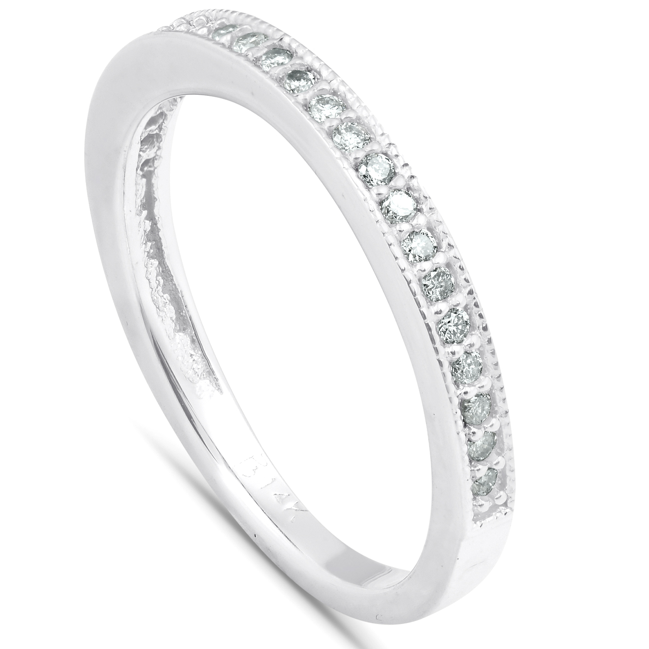 This women's wedding ring features 22 round cut natural diamonds. All diamonds are set in solid 14k white gold.