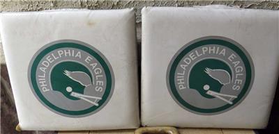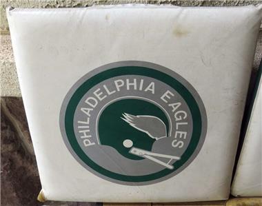 Featuring vibrant graphics and iconic Eagles branding, these seat pads are in good condition, showcasing the team spirit that defined those memorable game days. While they have aged gracefully, a gentle cleaning may be desired to restore them to their full glory.