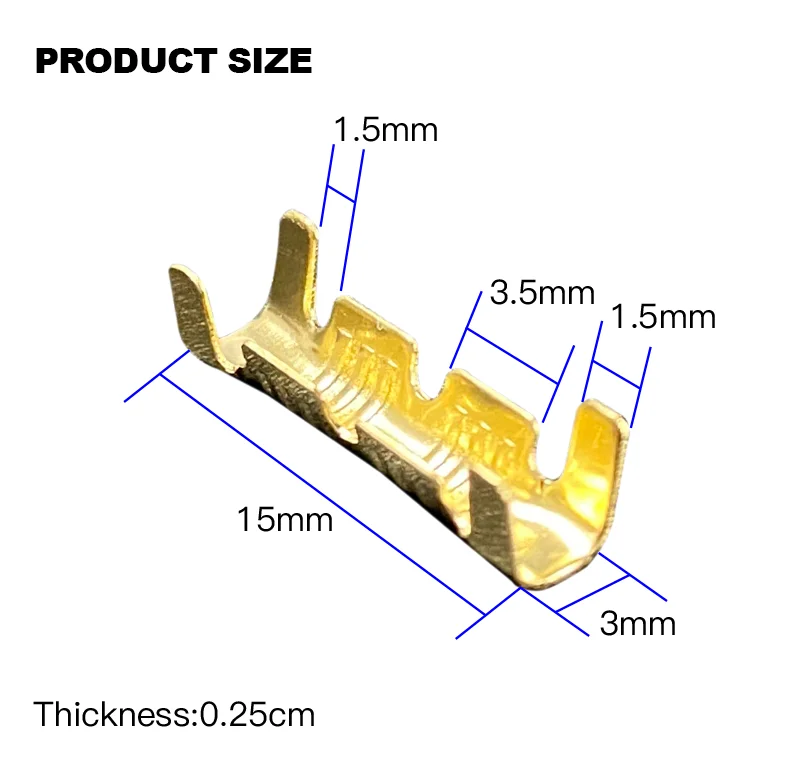 Description: Terminal material : Brass Crimp range:0.3-1.5mm2 Thick:0.32mm Package:50pcs / 100pcs/200pcs/1000pcs(gift)