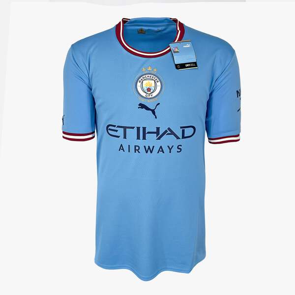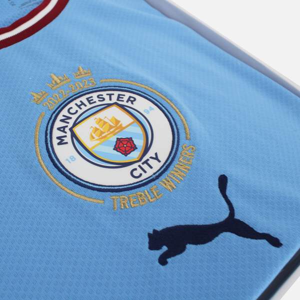 Manchester City Home football shirt, 2022-23 Treble winners edition. Kit includes added Triple King detail around the badge celebrating the clubs historic Champions League, FA Cup and Premier League victories. Treble vinyl print detail around badge.