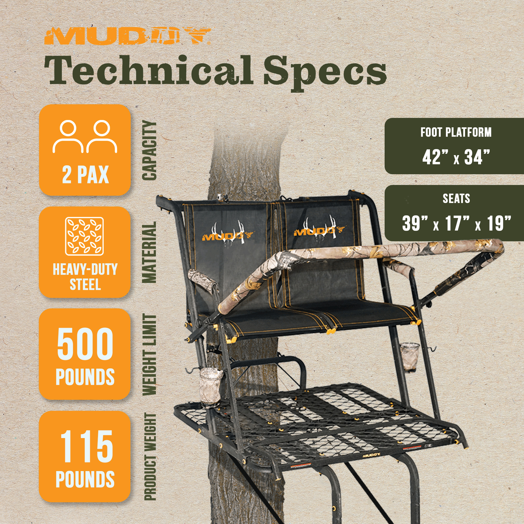 Fiber guard powder-coated steel makes this all-season ladder stand your go-to tree stand for years to come. This 2-person ladder stand is created with heavy-duty materials certified for up to 500 pounds. The convenient features of this tree stand include 2 interchangeable cup holders, 2 accessory hooks, flip-back seats for more space, and metal-on-metal silencing. Stay safe with the Hercules Cross Grip Safety System and full-body fall arrest system with a climbing belt.