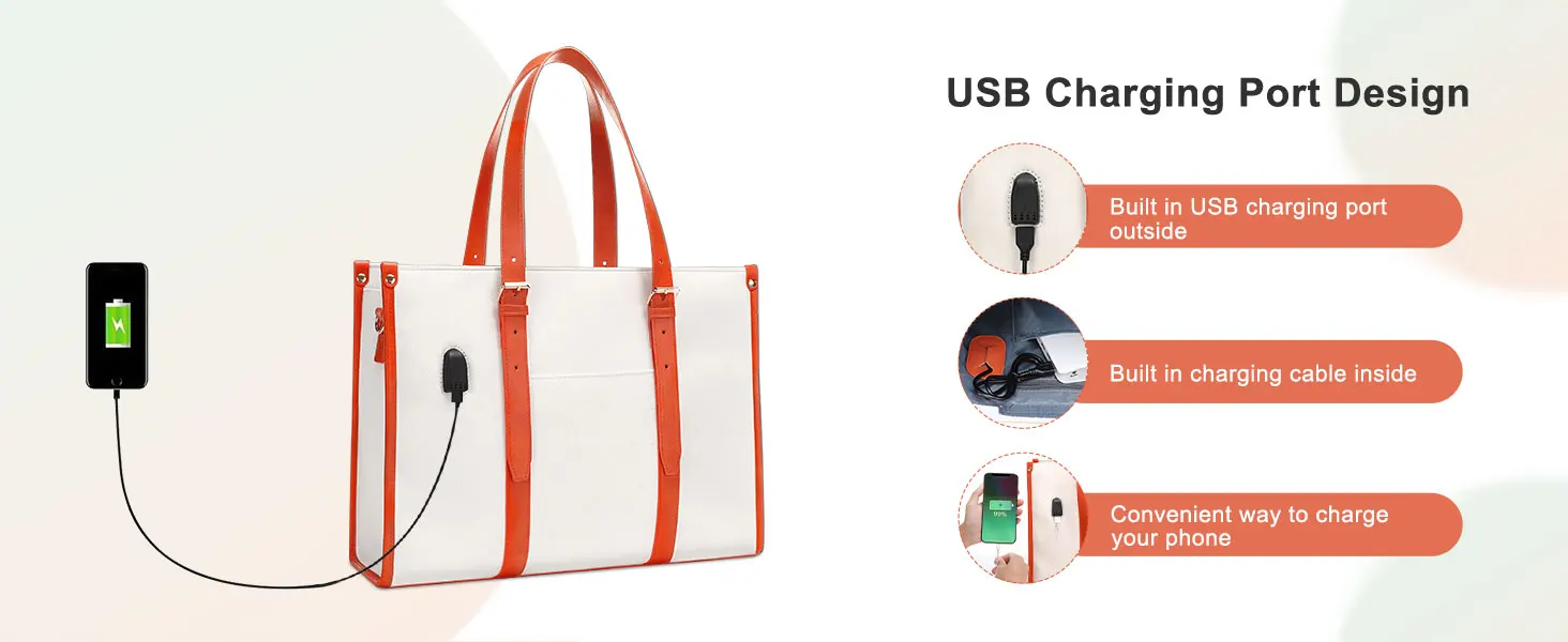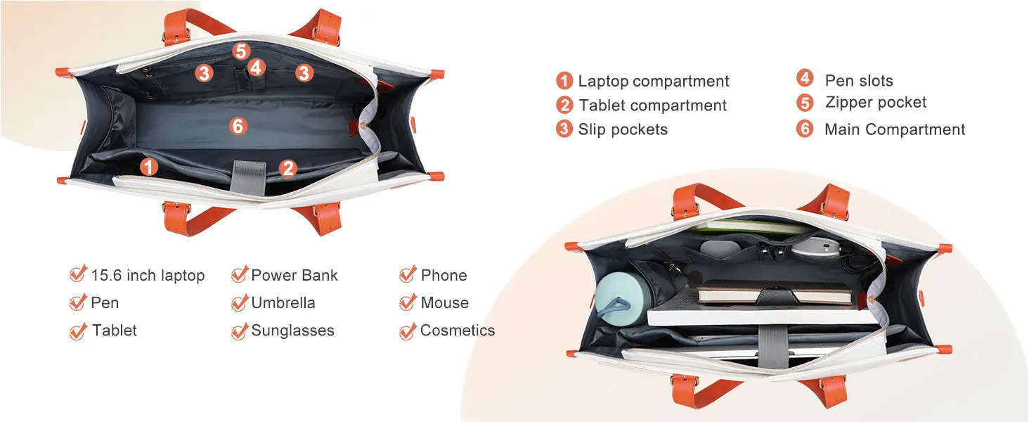 Roomy enough compartments for all your daily stuff. The computer compartment and tablet compartment provides a thick padded foam section with a hook & loop strap closure for your laptop or tablet. Professional design to protect your laptop against accidental impacts and scratches. The main compartments & matching color purse can store your jewelry, mobile phone, keys, mouse, passports, credit cards, cash, makeups and so on