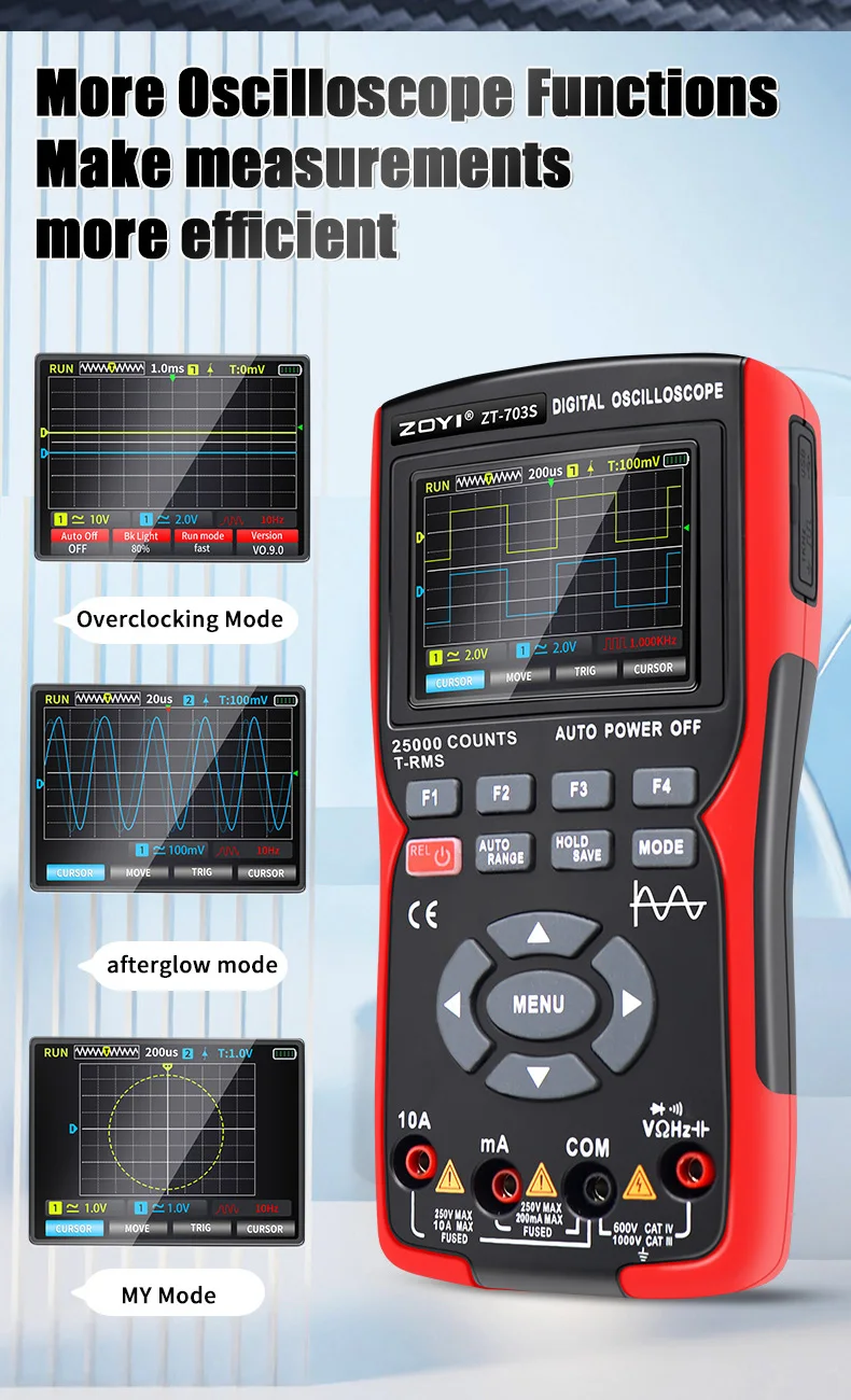 【Digital Oscilloscope Function】: The real-time sampling rate of the oscilloscope is up to 280MS/s, which can capture more signal details and provide more accurate measurement results. 50MHz bandwidth can meet the testing needs of most electronic devices, both high-frequency and low-frequency signals can be easily coped with. More Oscilloscope functions of overclocking function, afterglow mode, and X Y mode, making measurements more cost-effective.