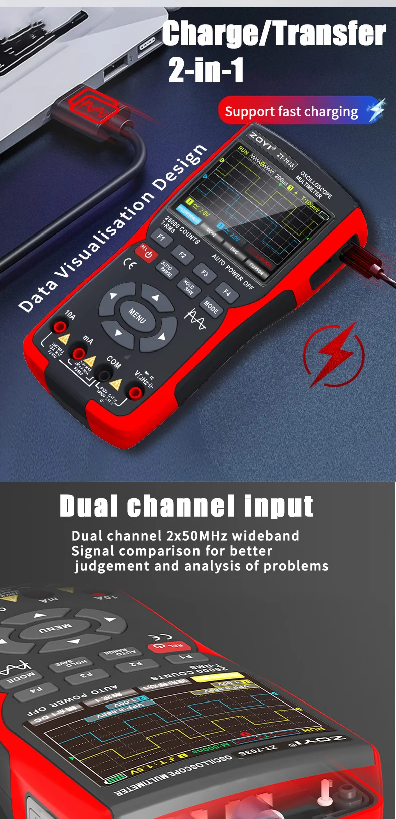 3in1 design, this product ingeniously integrates digital oscilloscope, multimeter, and signal source functions in one device. Equipped with a 3.5-inch color display. Multifunctional design, with ACvoltage, DCvoltage, ACcurrent, DCcurrent, resistance, capacitance test function. Dual channel oscilloscope function, with 50MHz bandwidth and 280MS sampling rate. Built-in waveform signal generator, with automatic waveform measurement and recognition function, no need to display the measured signal waveform clearly without measured signal waveform.