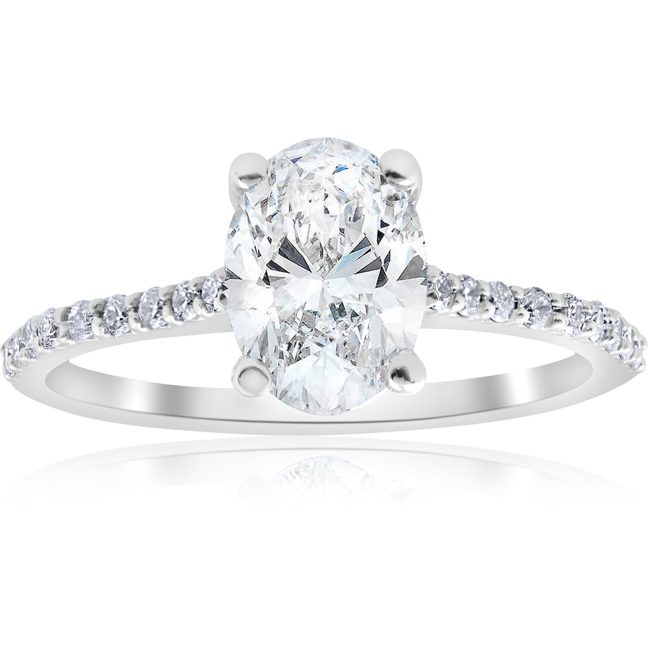 Womens ring features a stunning 1ct oval lab grown diamonds. The ring is flanked with 18 round cut lab grown diamonds. All diamonds are prong set in solid 14k white gold. This is an iconic classic ring that will last and ben in style forever.