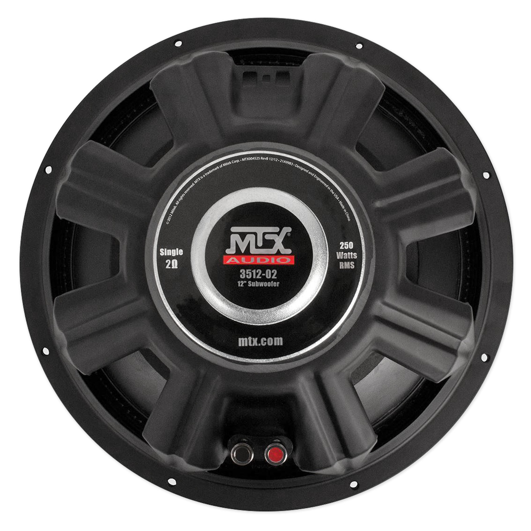 The 3512-02 is a 12" single voice coil, 2 ohm, 250 watt Car Audio Subwoofer designed to deliver outstanding SPL and sound quality in an affordable combination of state-of-the-art MTX sub features...and it rocks.