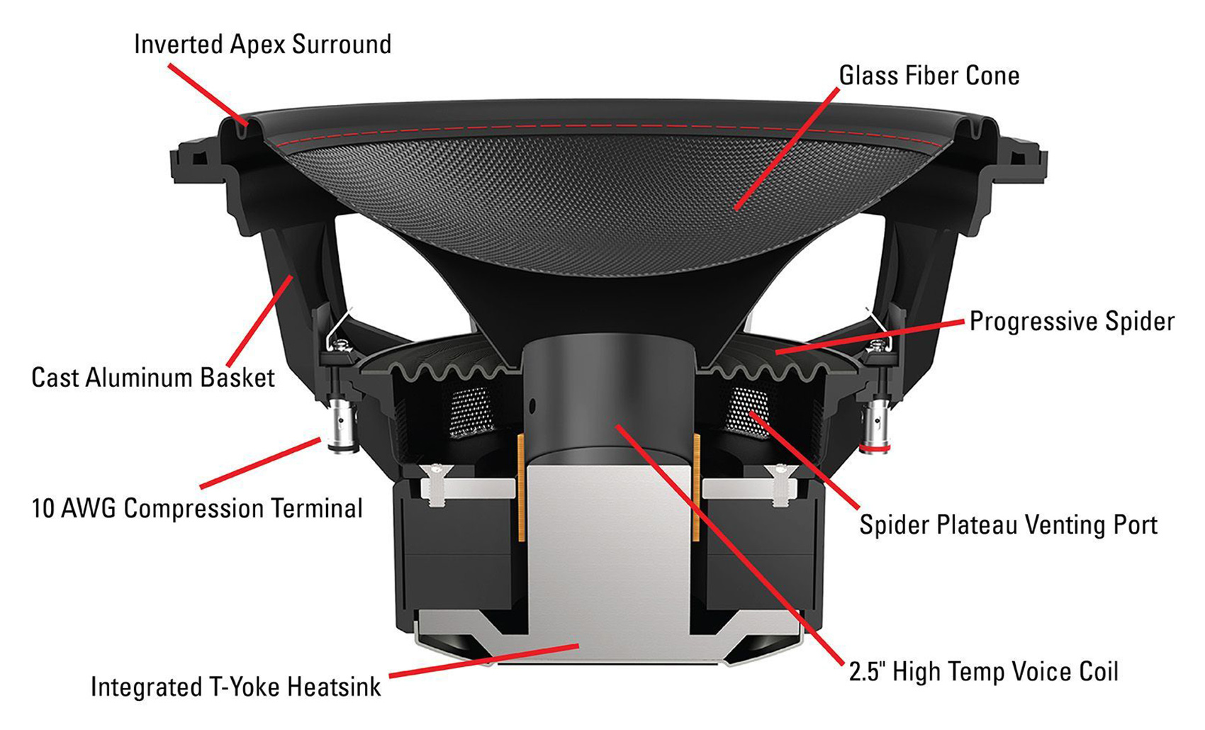 This super Car Audio Subwoofer features an Inverted Apex Surround that increases surface area and Xmax allowing for increased volume displacement and higher SPL as well as a progressive, layered spider that eliminates break in time and lowers distortion resulting in improved sound quality. This subwoofer has a dual layer thermal management system that incorporates Spider Plateau Venting, a mechanical cooling process that targets cool air at the voice coil, and an integrated t-yoke heat sink that helps eliminate excess temperature for long term performance. The glass fiber cone offers excellent stiffness to weight ratio providing outstanding sensitivity.
